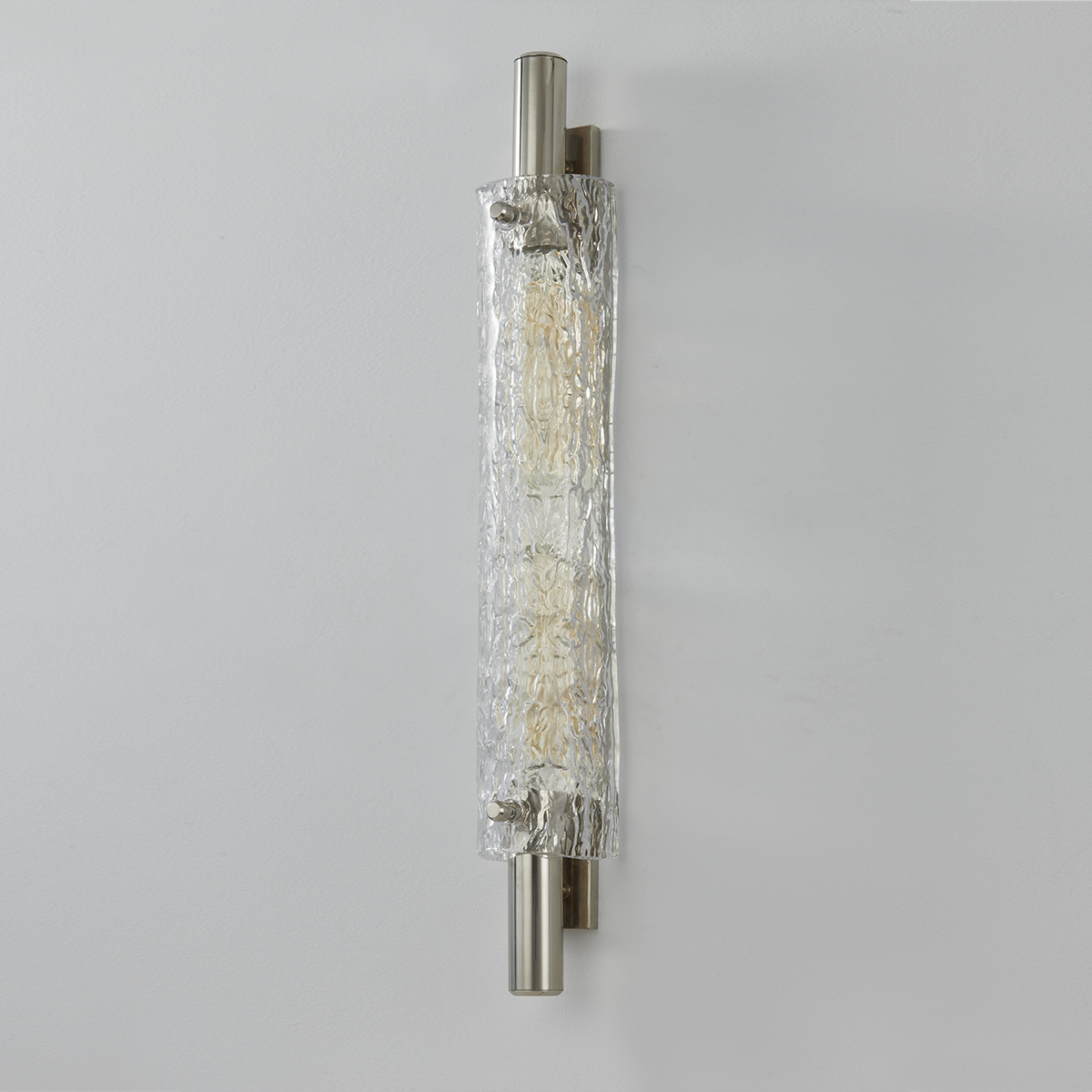 Clean lines and a familiar silhouette pair with unique materials and thoughtful details to give Harwich an elevated look. A curved piastra glass shade hugs a thick cylindrical metal frame and rectangular backplate. The stunning textured glass technique looks glamorous and gives this piece a luxurious quality. Harwich is available as a 1-light or 2-light sconce in two finishes and can be mounted horizontally or vertically.