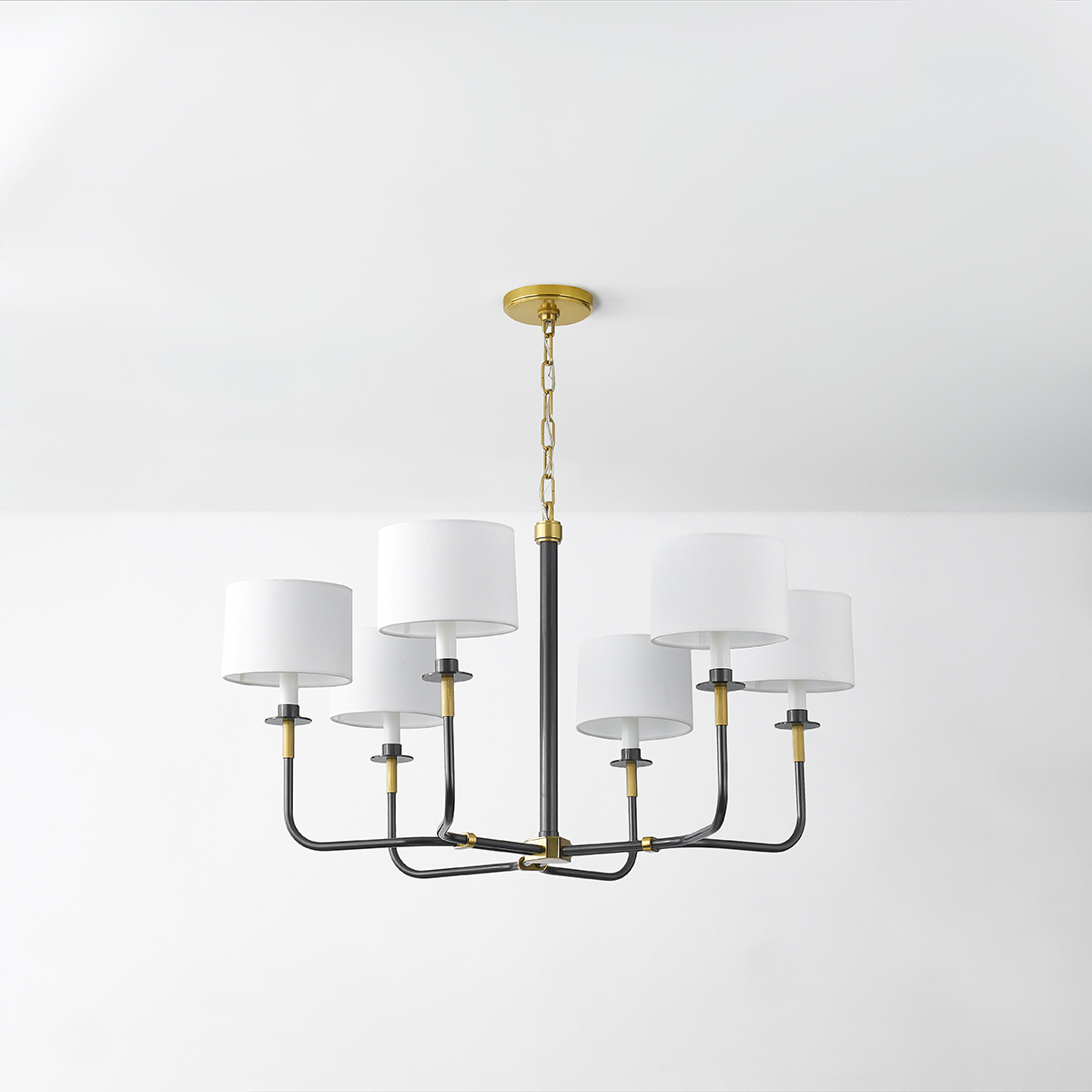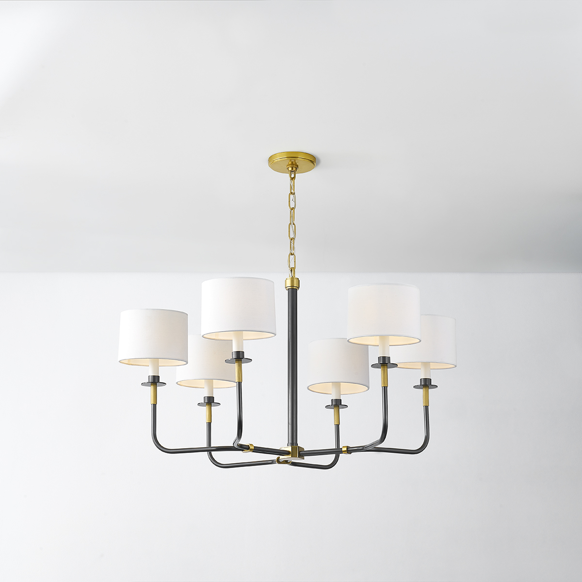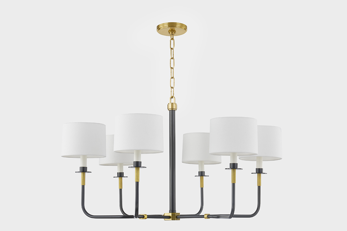 As either a chandelier or sconce, Paramus takes traditional elements, like arm and shade shape, and updates them by playing with scale. Elongated arms extend upwards to support candle sleeves topped with white linen drum shades. Available as a chandelier in two sizes or as a wall sconce, Paramus comes with the option of an Aged Brass or combination Old Bronze and Aged Brass finish. In its largest chandelier rendition, nine arms are staggered at varying heights to create a standout piece.
