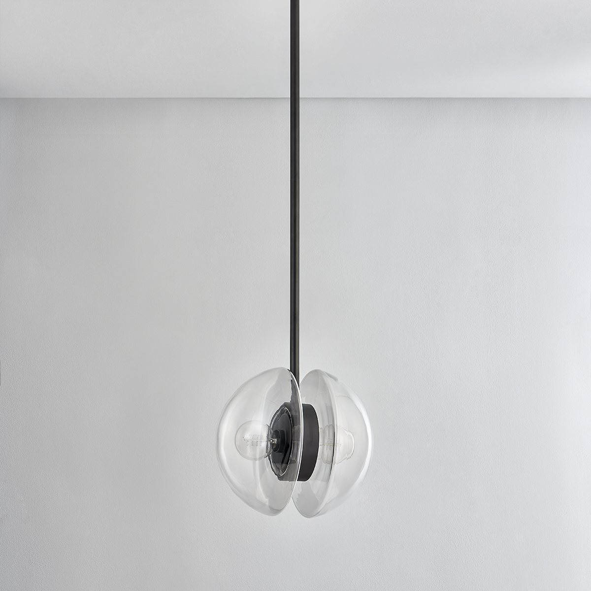 Kert combines glass and metal in a fresh and functional way. A pair of half-round, clear glass shades are enclosed behind the bulb and mounted on a ring of metal at the center, giving the piece an impressive, sculptural feel. Large in scale and highly versatile, Kert is available as a wall sconce that can be mounted vertically or horizontally, a linear, and a pendant and chandelier in two sizes.