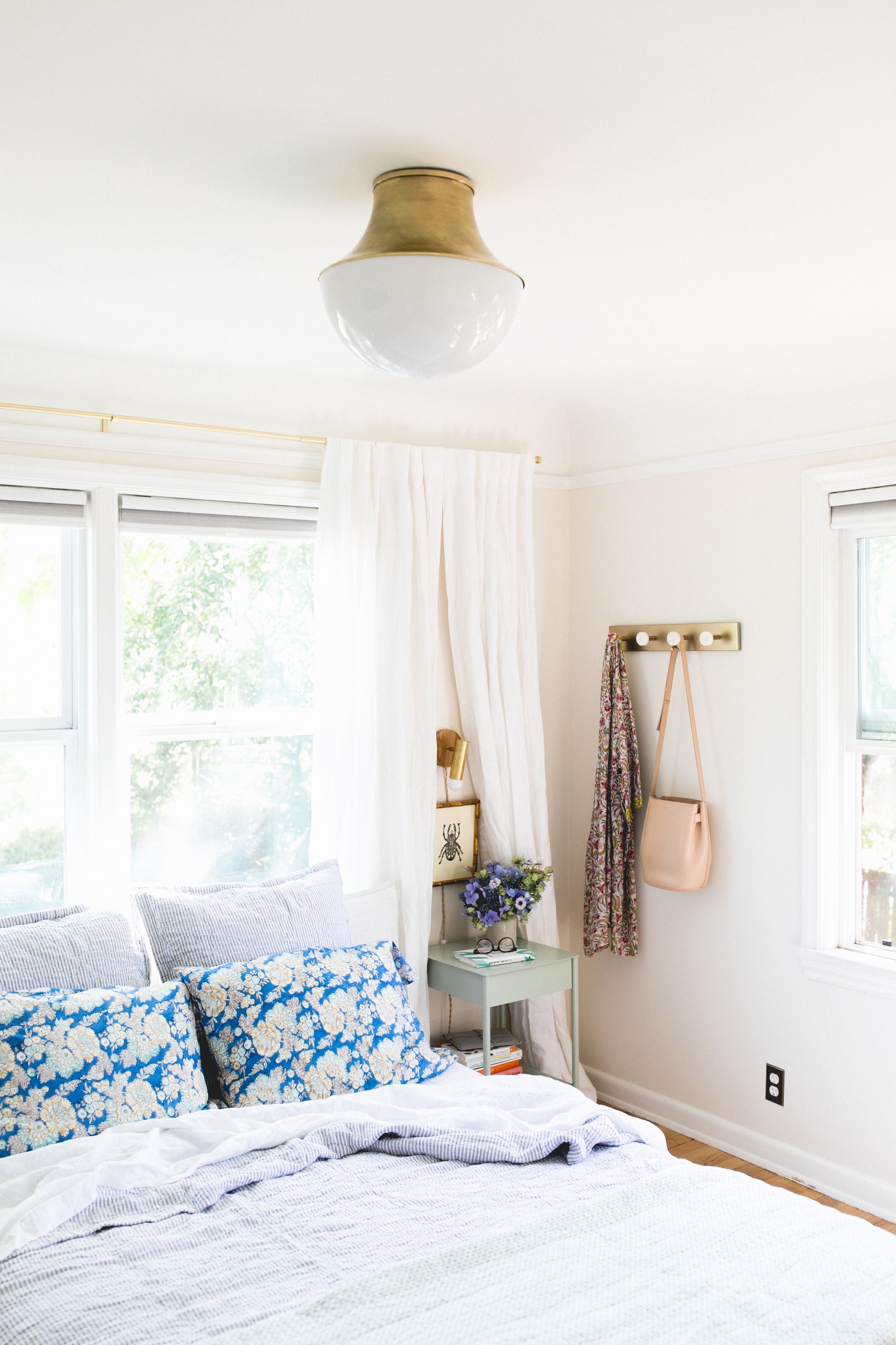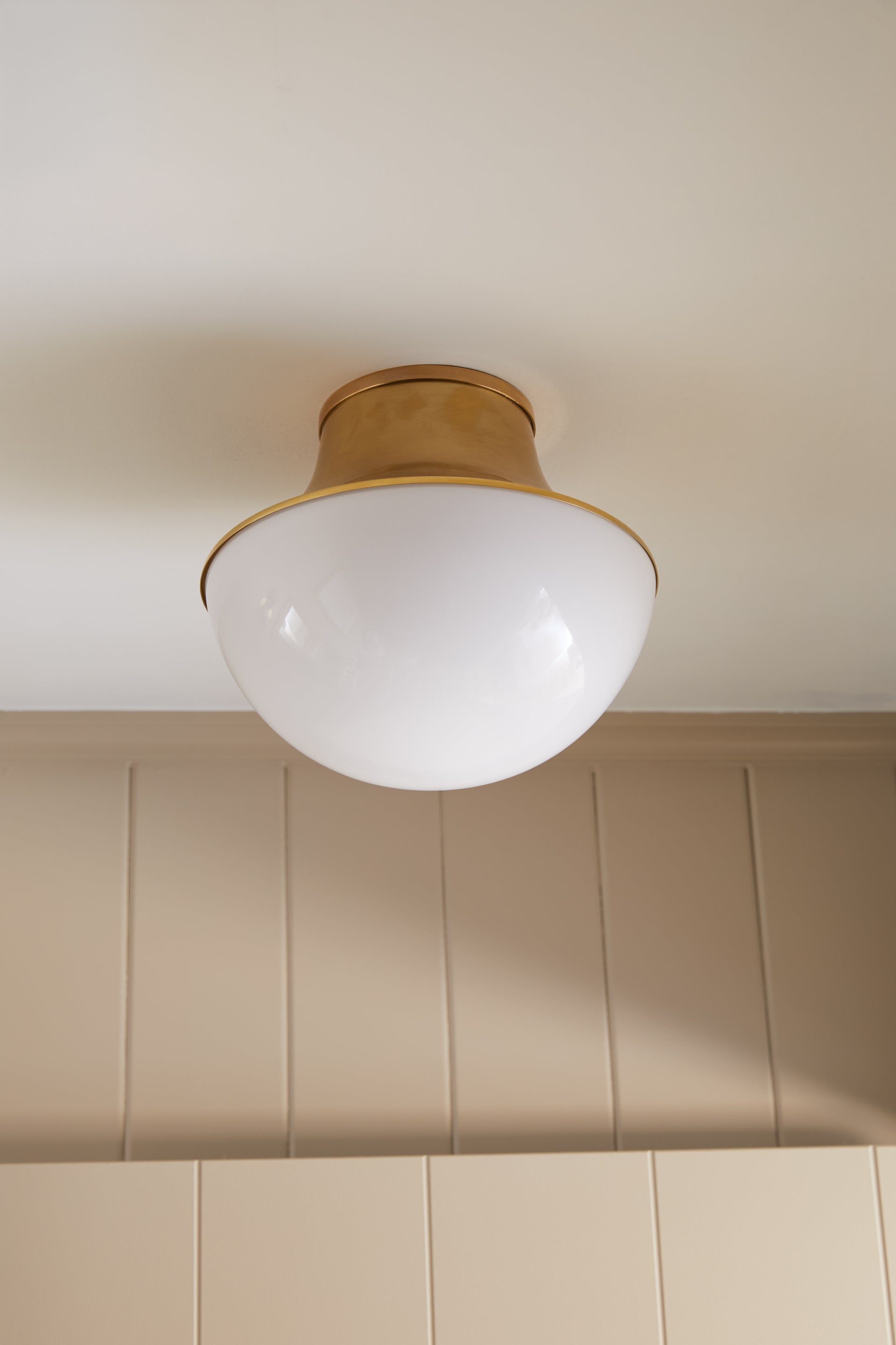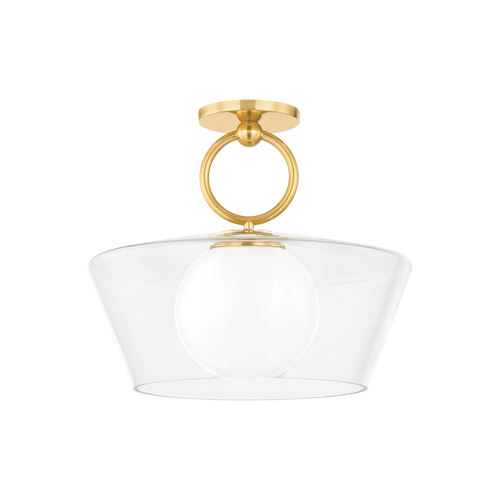A demi-globe glass diffuser, clear on the inside, creates a stunning glow over any space. Spun metal swerves out in a funnel shape to meet the shade, making for an attractive silhouette.