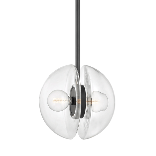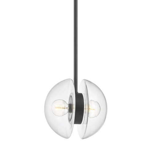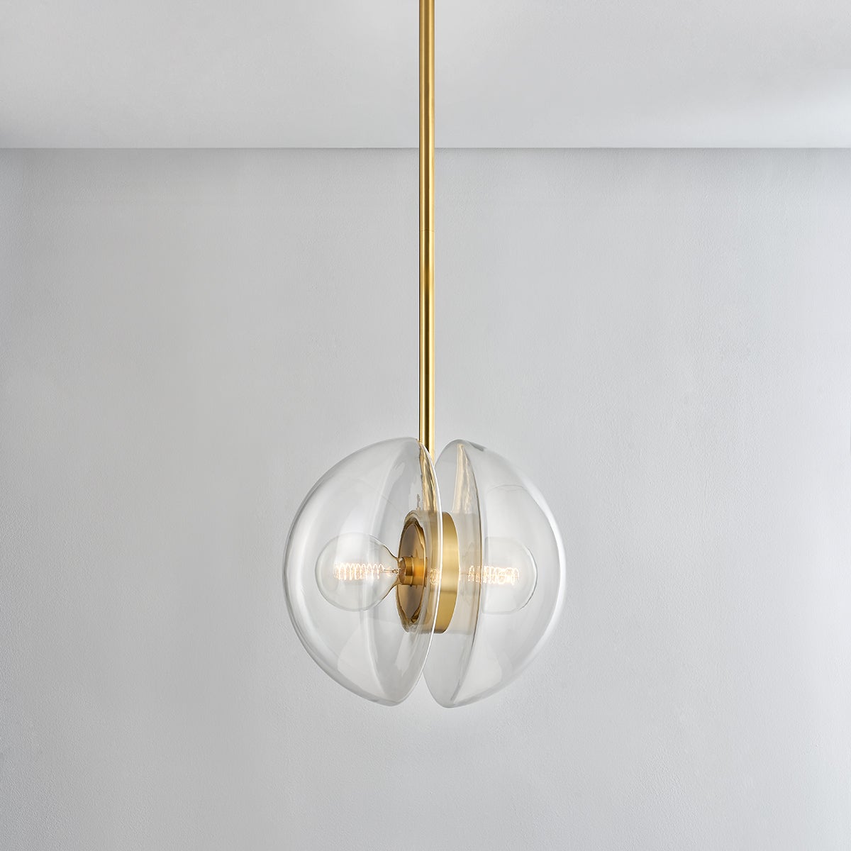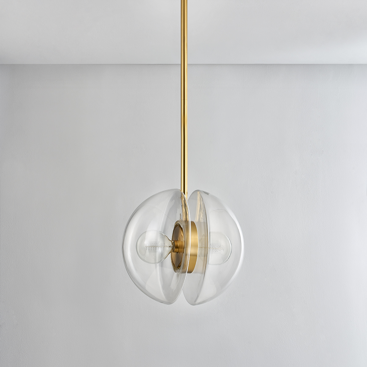 Kert combines glass and metal in a fresh and functional way. A pair of half-round, clear glass shades are enclosed behind the bulb and mounted on a ring of metal at the center, giving the piece an impressive, sculptural feel. Large in scale and highly versatile, Kert is available as a wall sconce that can be mounted vertically or horizontally, a linear, and a pendant and chandelier in two sizes.