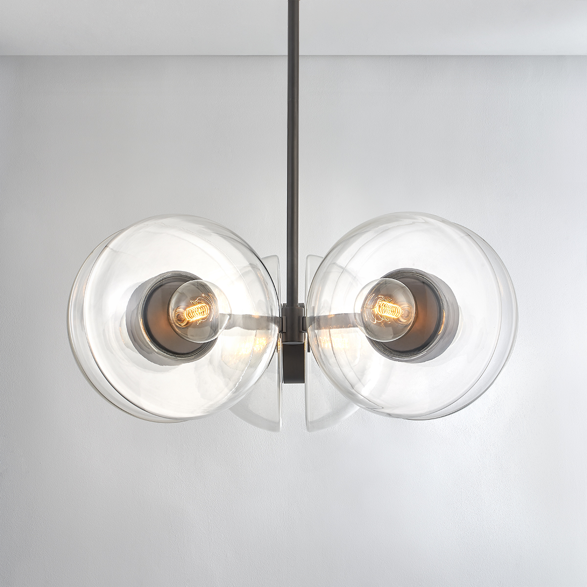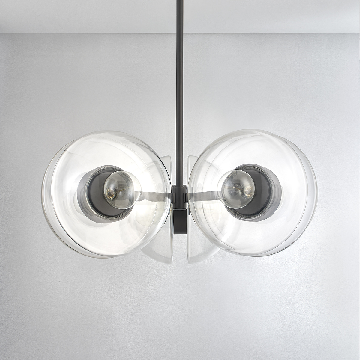 Kert combines glass and metal in a fresh and functional way. A pair of half-round, clear glass shades are enclosed behind the bulb and mounted on a ring of metal at the center, giving the piece an impressive, sculptural feel. Large in scale and highly versatile, Kert is available as a wall sconce that can be mounted vertically or horizontally, a linear, and a pendant and chandelier in two sizes.