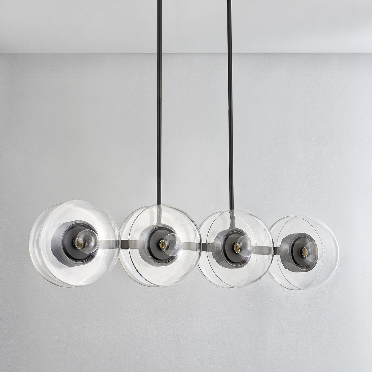 Kert combines glass and metal in a fresh and functional way. A pair of half-round, clear glass shades are enclosed behind the bulb and mounted on a ring of metal at the center, giving the piece an impressive, sculptural feel. Large in scale and highly versatile, Kert is available as a wall sconce that can be mounted vertically or horizontally, a linear, and a pendant and chandelier in two sizes.