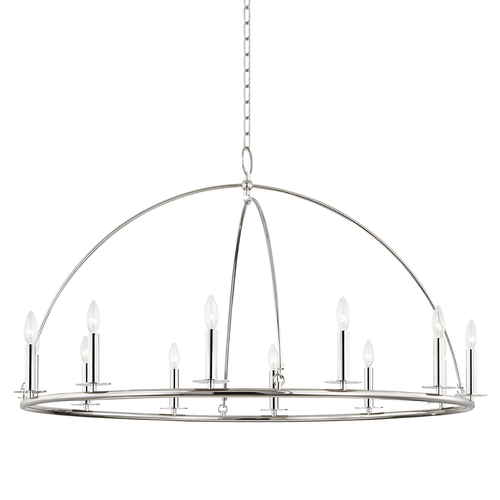 Metal arches bring a smooth dome-shape and add an interesting twist to this traditional wagon-wheel chandelier. Candelabra bulbs around the circumference provide an abundance of bright, beautiful light. Available as a single or double-tier in Aged Brass, Polished Nickel or Aged Iron.
