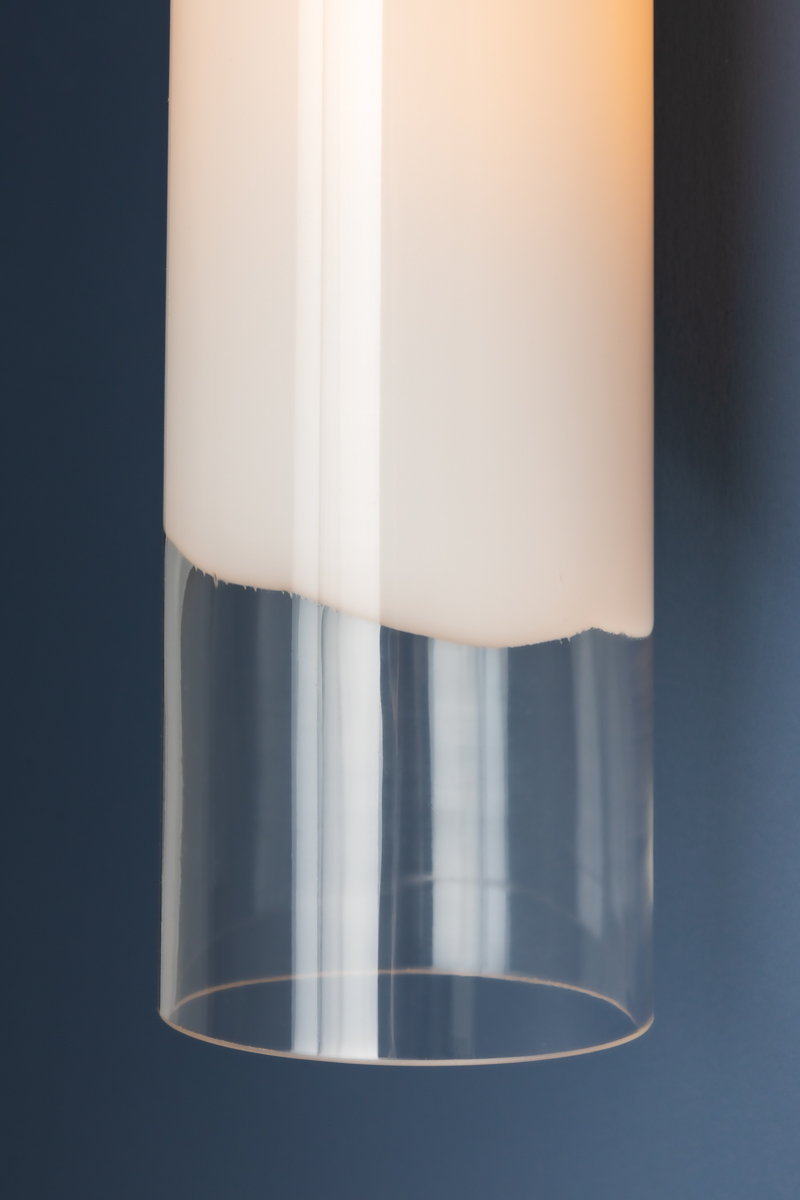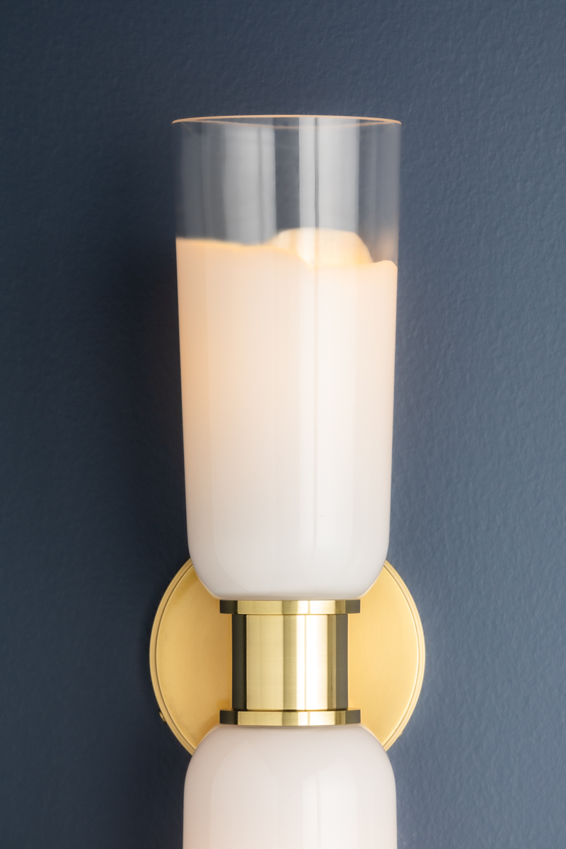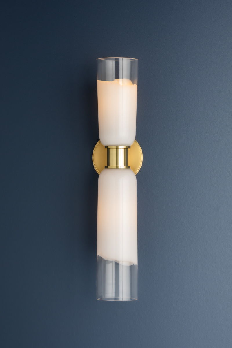 Taking its cue from an hourglass in both form and function, the Wasson wall sconce features a belted, elongated silhouette with orizzante glass shades that create the illusion of the opal glass flowing from one shade to the next. The wave-like irregular lines in the glass and the asymmetry of the shades draw the eye. Available in Aged Brass and Polished Nickel finishes.