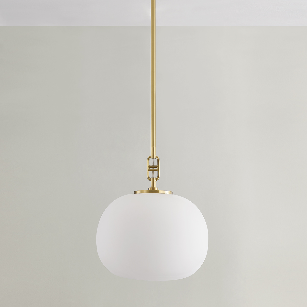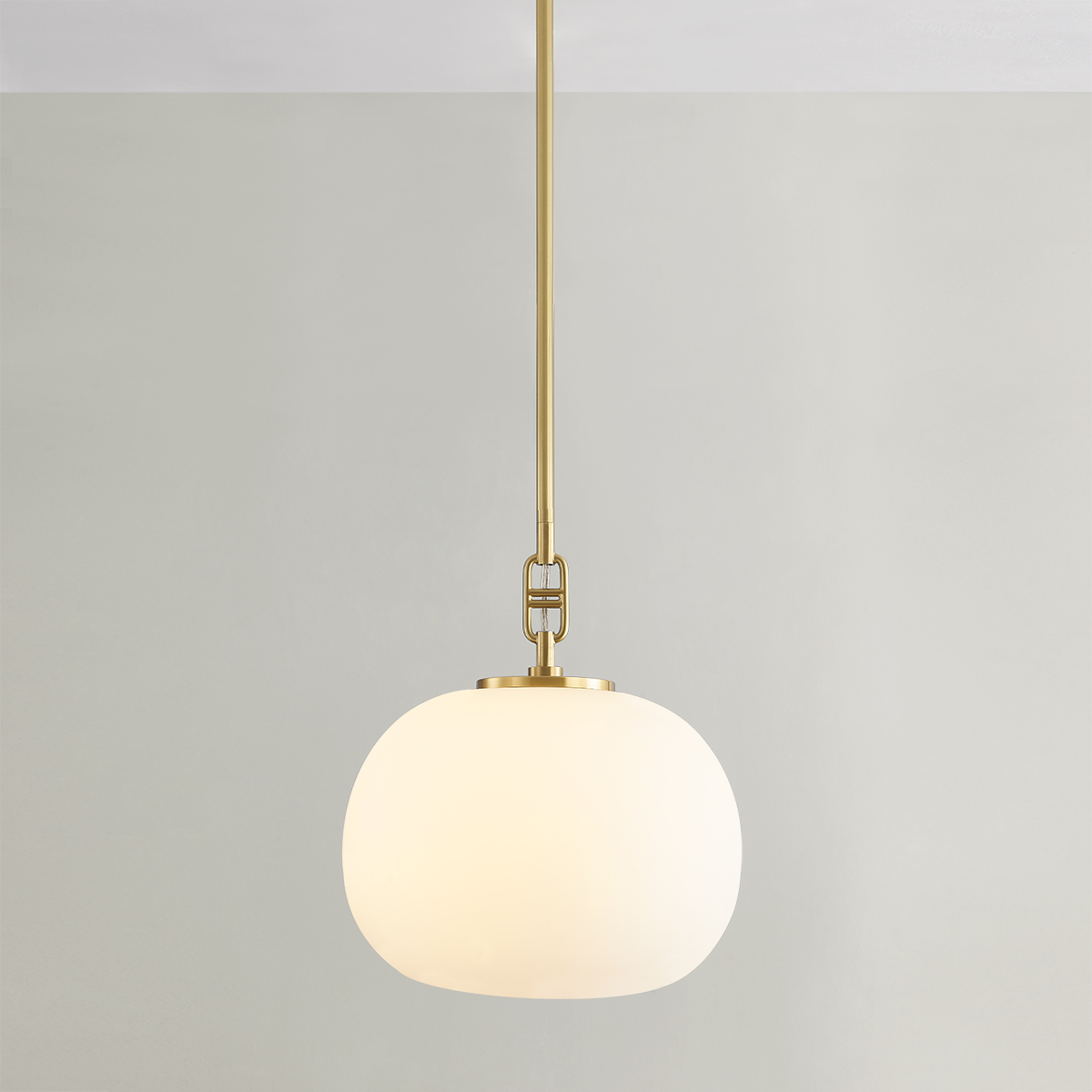 Ingels' elliptical-shaped opal matte glass shade is a refreshing update on a traditional globe. The intricate, buckle-like detail connecting the shade and stem adds a fashionable element to this stand-out pendant. Versatile and usable, Ingels is available in three sizes and two classic finishes.