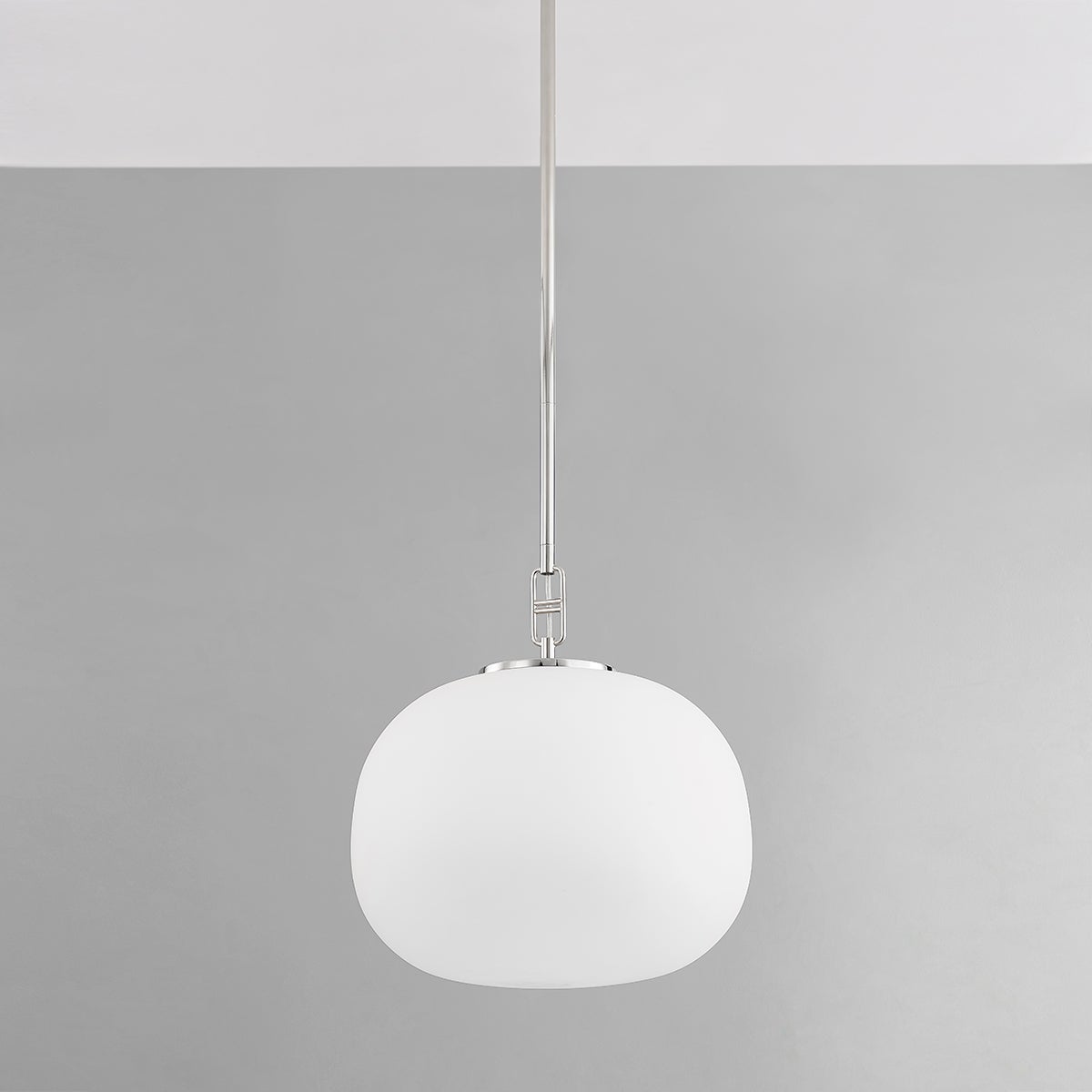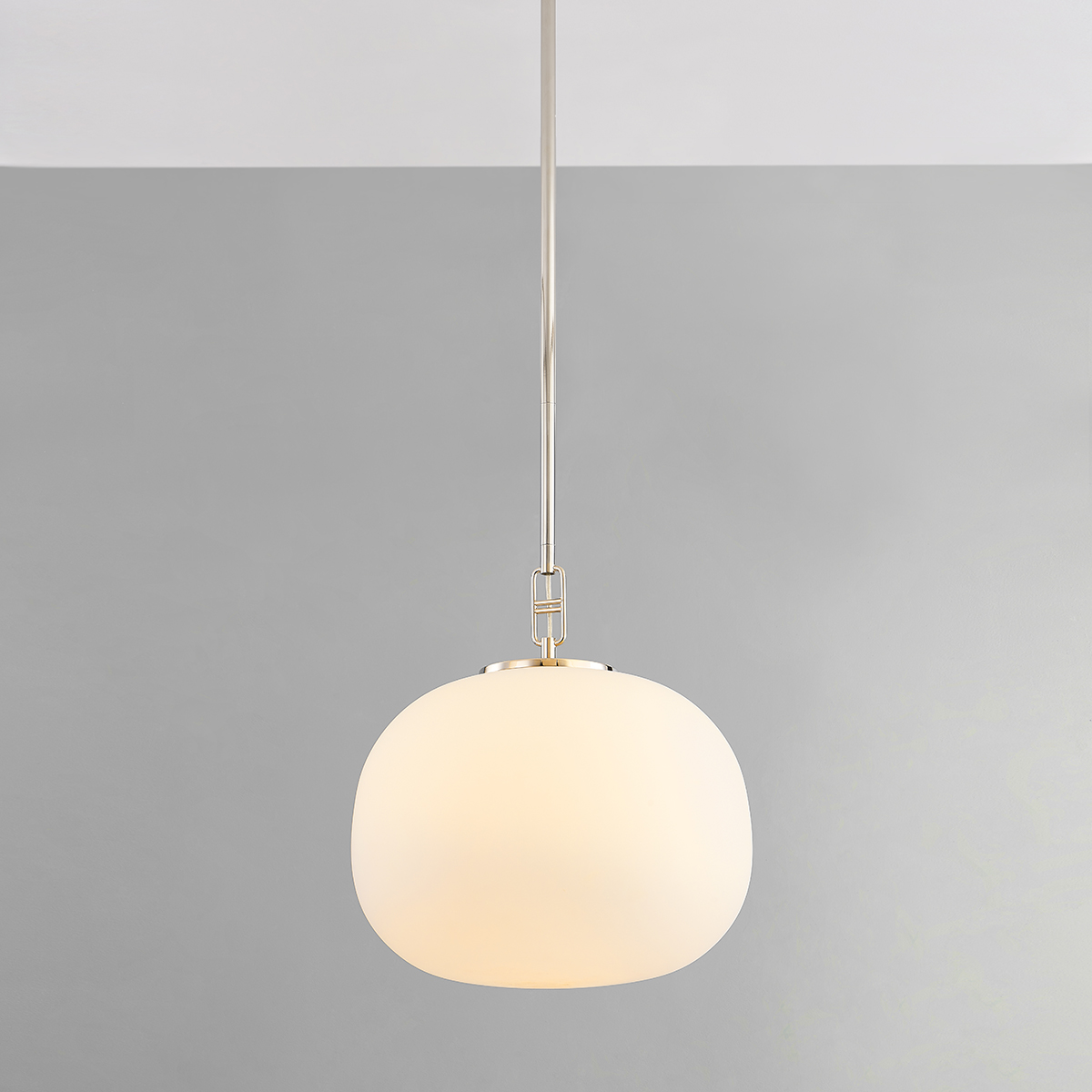 Ingels' elliptical-shaped opal matte glass shade is a refreshing update on a traditional globe. The intricate, buckle-like detail connecting the shade and stem adds a fashionable element to this stand-out pendant. Versatile and usable, Ingels is available in three sizes and two classic finishes.