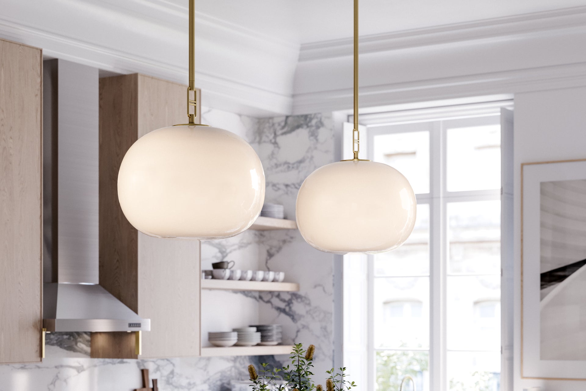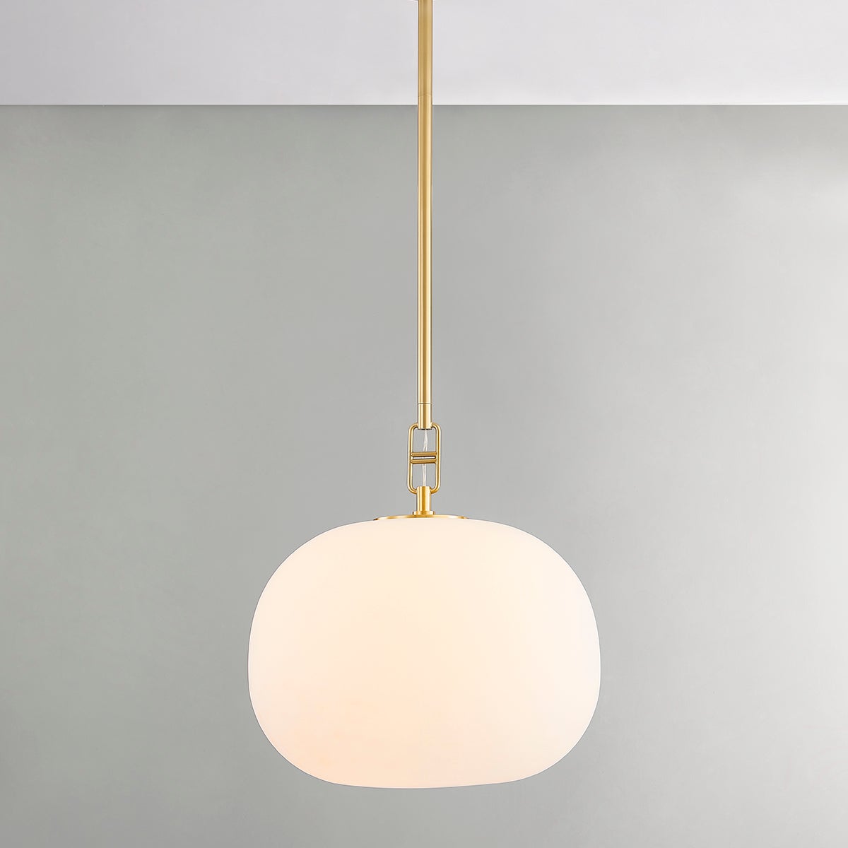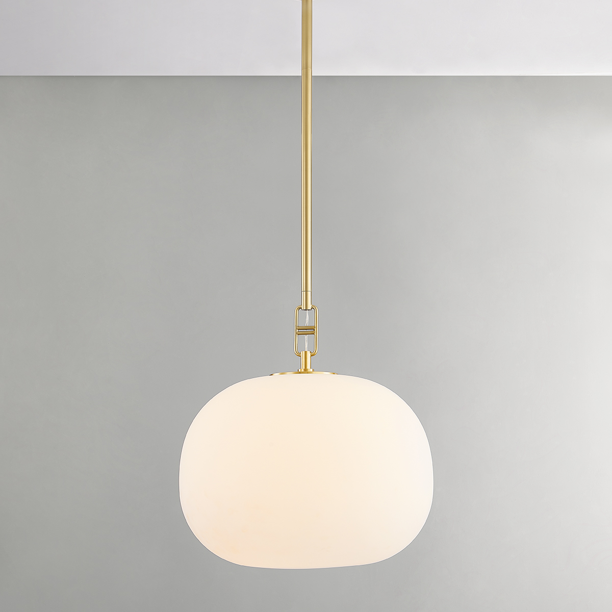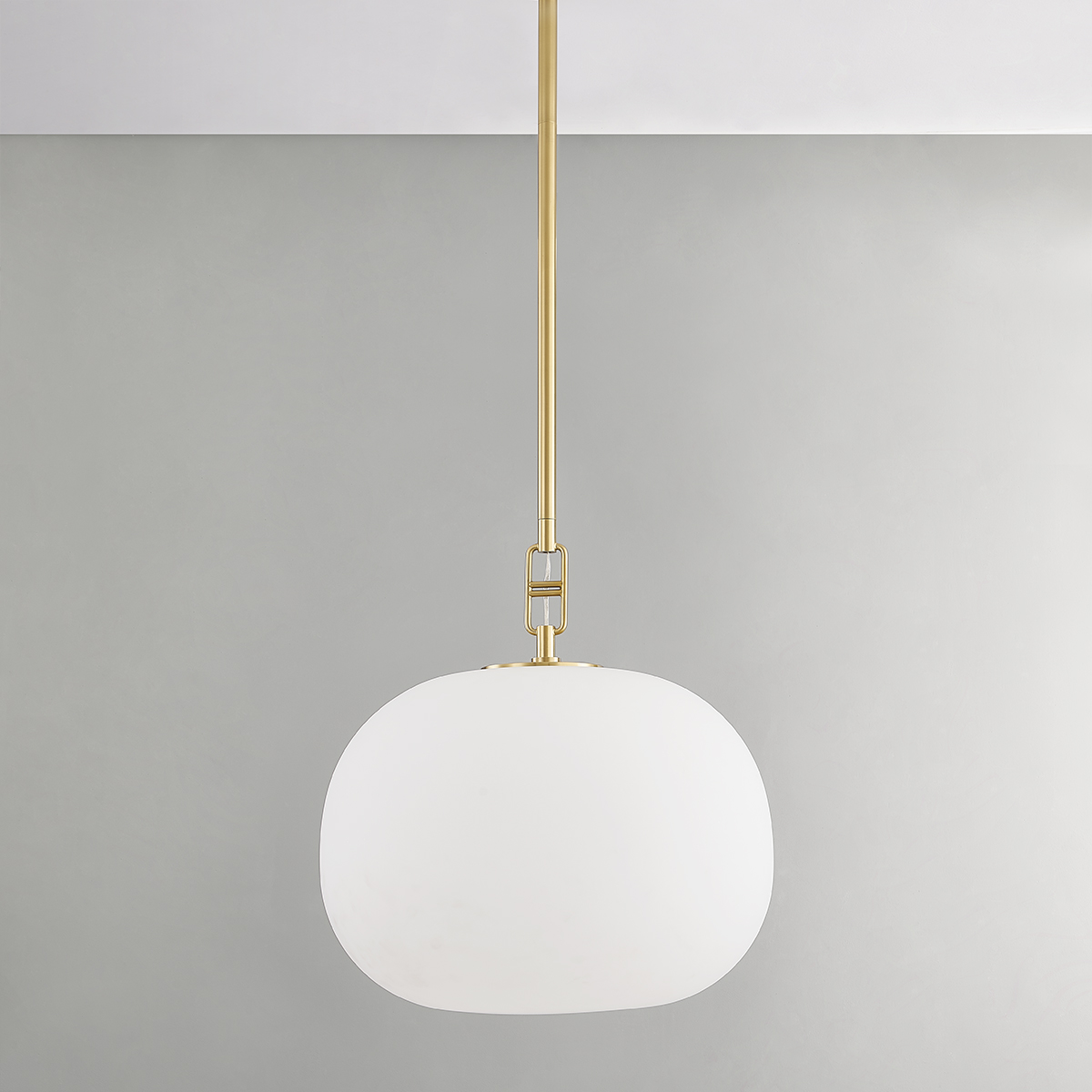Ingels' elliptical-shaped opal matte glass shade is a refreshing update on a traditional globe. The intricate, buckle-like detail connecting the shade and stem adds a fashionable element to this stand-out pendant. Versatile and usable, Ingels is available in three sizes and two classic finishes.