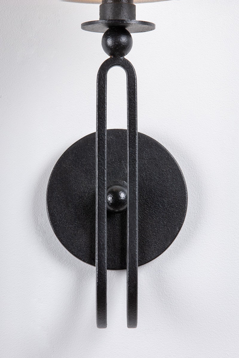 A swooping racetrack arm "hooked" over a circular backplate adds a playful freshness to this familiar sconce silhouette. Timeless materials, Forged Iron metalwork and an off-white linen shade, make this updated design useable in spaces throughout the home. Part of our Lauren Liess collection.