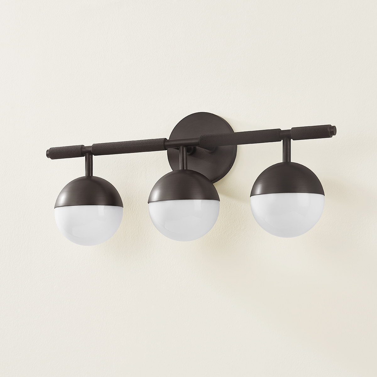 Taking inspiration from modern jewelry, Enson features architecturally suspended Opal Shiny Glass globes that lend a sophisticated feel to the piece. The silhouette is clean and modernist, but upon closer inspection, one notices the textural, knurled details. Available as a 3 or 4-light wall fixture, Enson is finished in warm, reflective Patina Brass or dark Bronze.