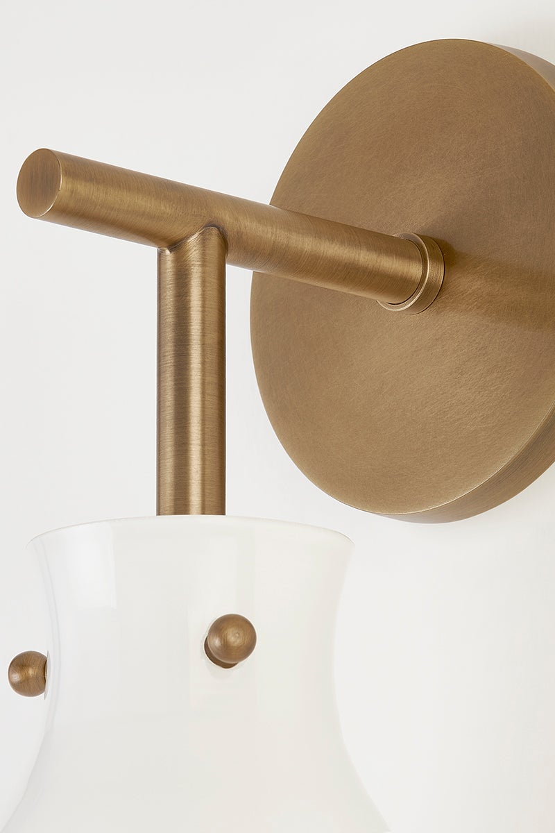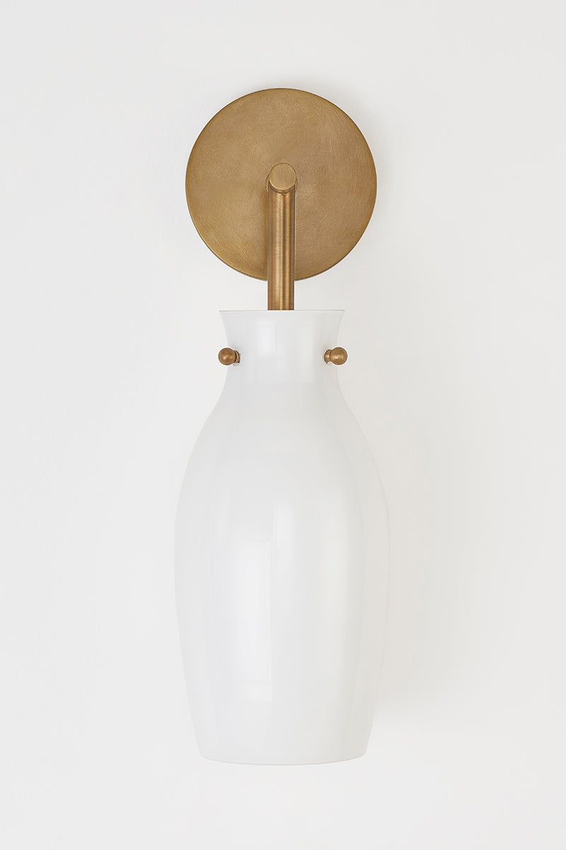 Drawing inspiration from the tall, reedy plants that grow in the marshland, Geyser wall sconce and floor lamp feature an elegant opal glossy glass shade, suspended on slender Patina Brass arms. The neutral tones, soft lines, and elevated organic feel make this mid-century-influenced design blend perfectly with many styles and color palettes.
