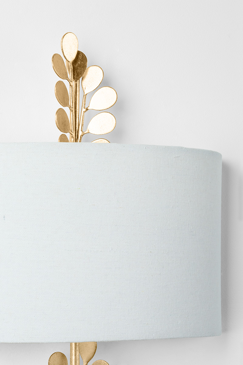 A botanical influence give these recognizable lantern and wall sconce silhouettes a fresh feel and a pretty, organic vibe. Smooth leaf shapes travel vine-like up and through the center of the lantern candlesticks and white linen sconce shade. A beautiful warm light reflects off the Vintage Gold Leaf finish.