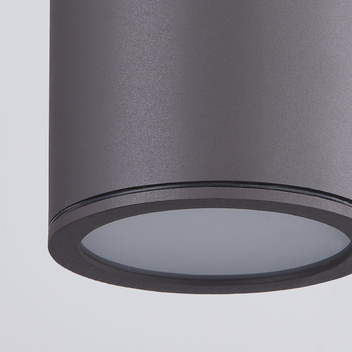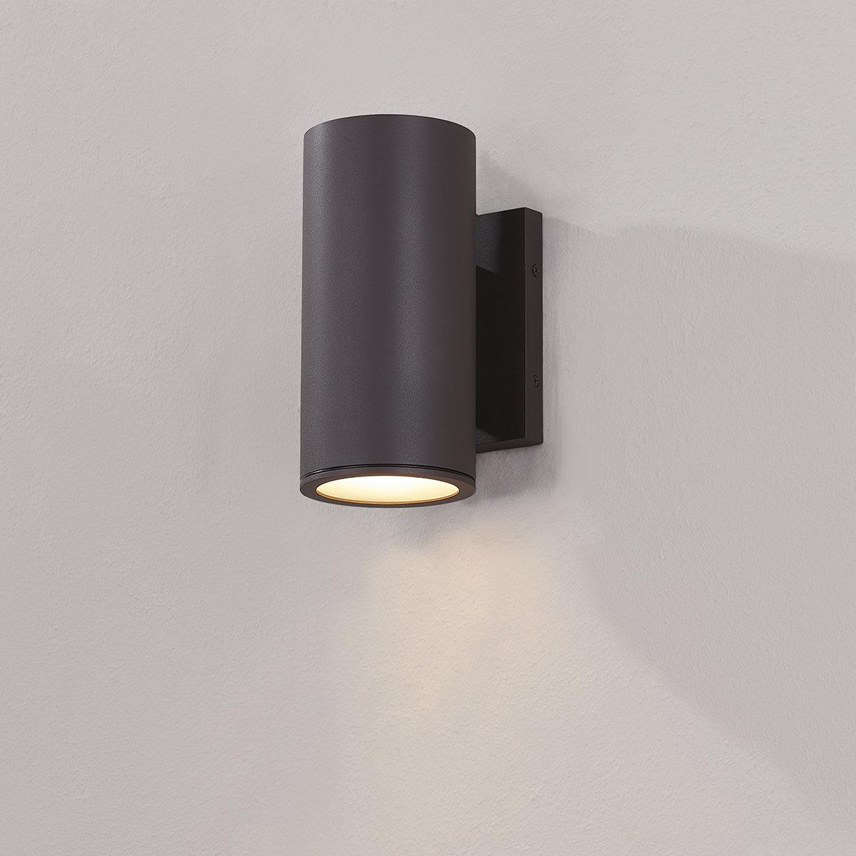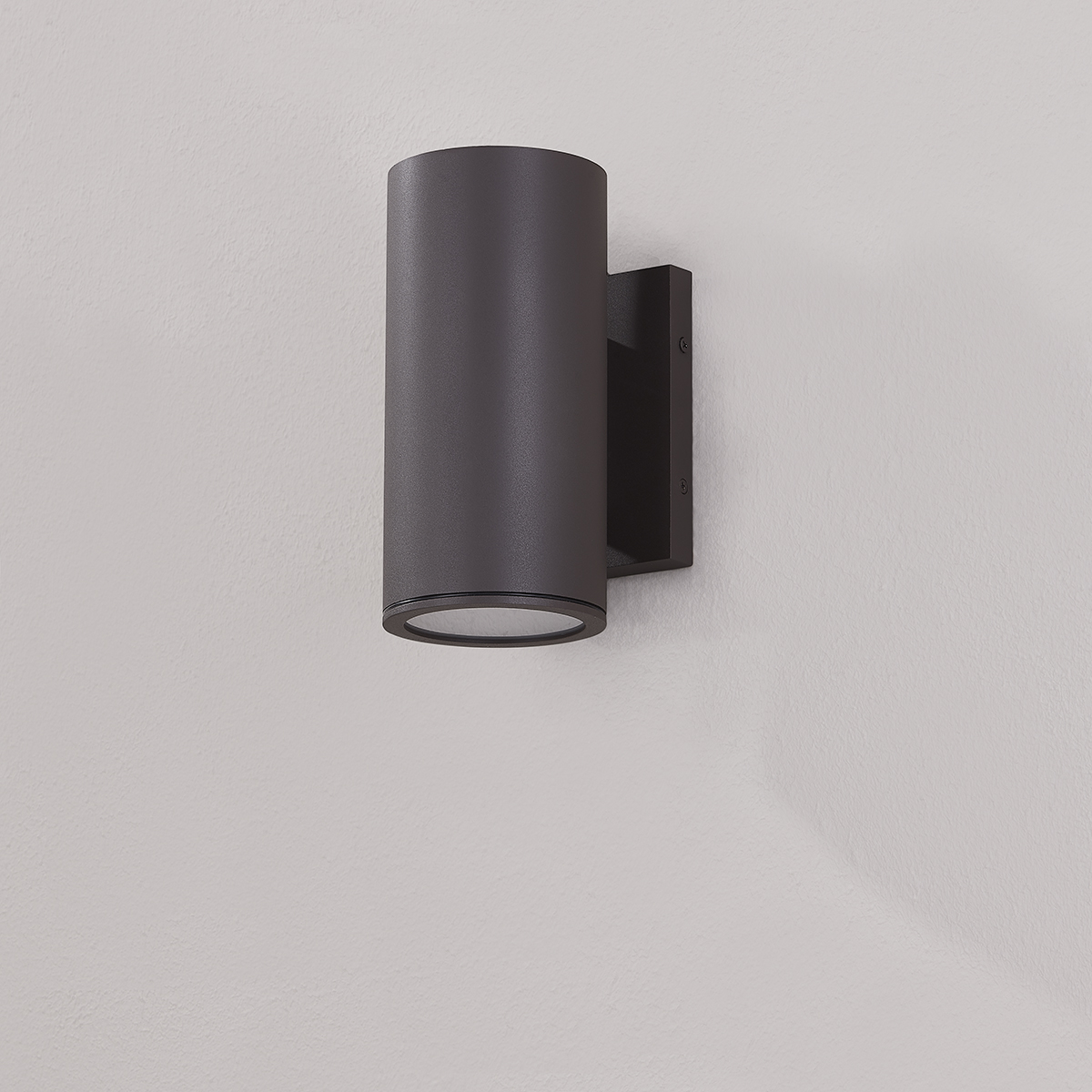 With its smooth, cylindrical shade and square backplate, this exterior sconce feels modern and architectural. Light flows through the etched glass to wash the wall in a soft glow and provide ambient illumination on walkways. Available in a Texture Black or Texture Bronze finish in one- or two-light options to fit any exterior. One-light fixture is Dark-Sky compliant.