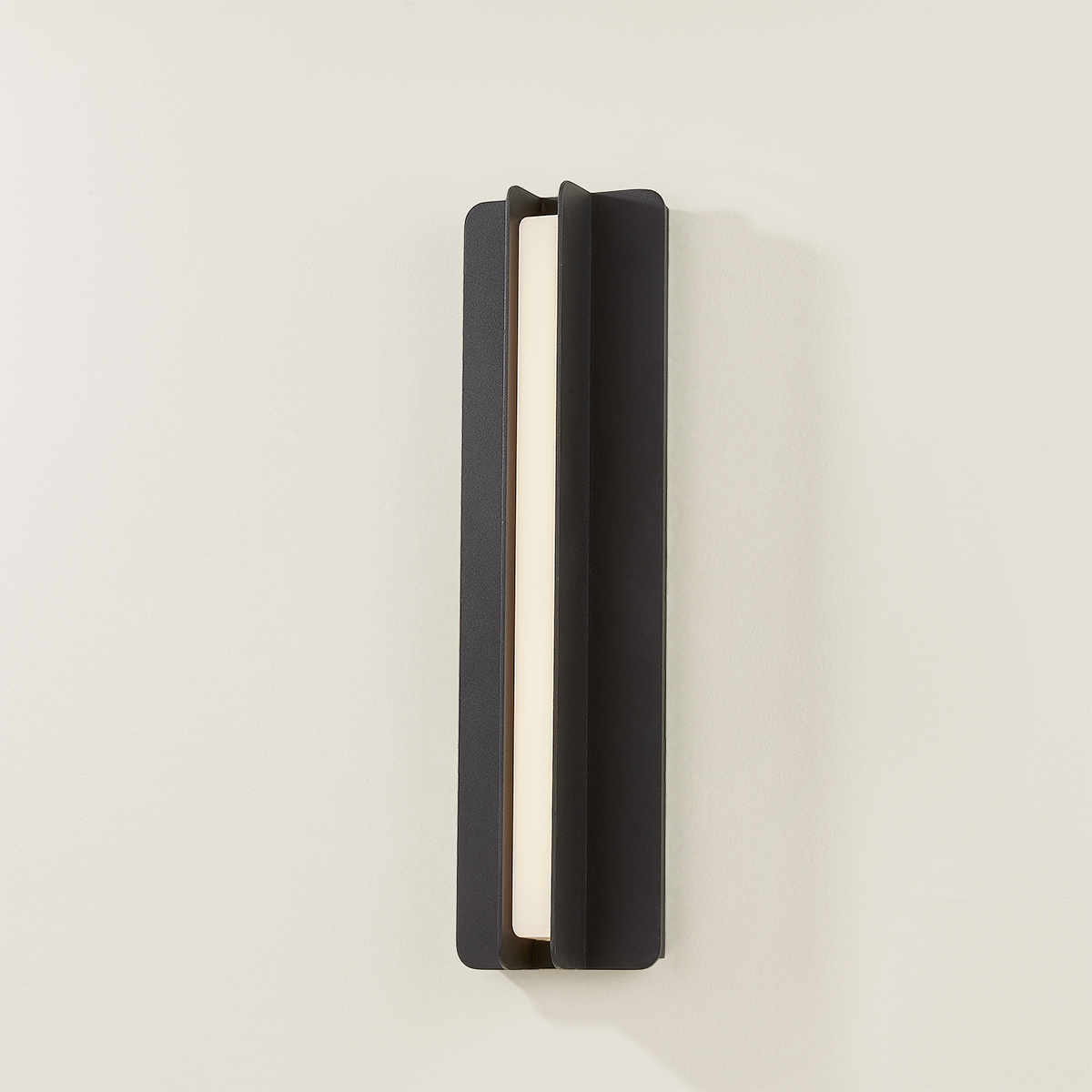 A minimalist, integrated LED fixture creates a vista of illumination in the architectural Dune sconce. A slender beam of light emanates from between two bent flanges of metal on this modern fixture. Dune is available in two sizes, both in a Textured Black finish.