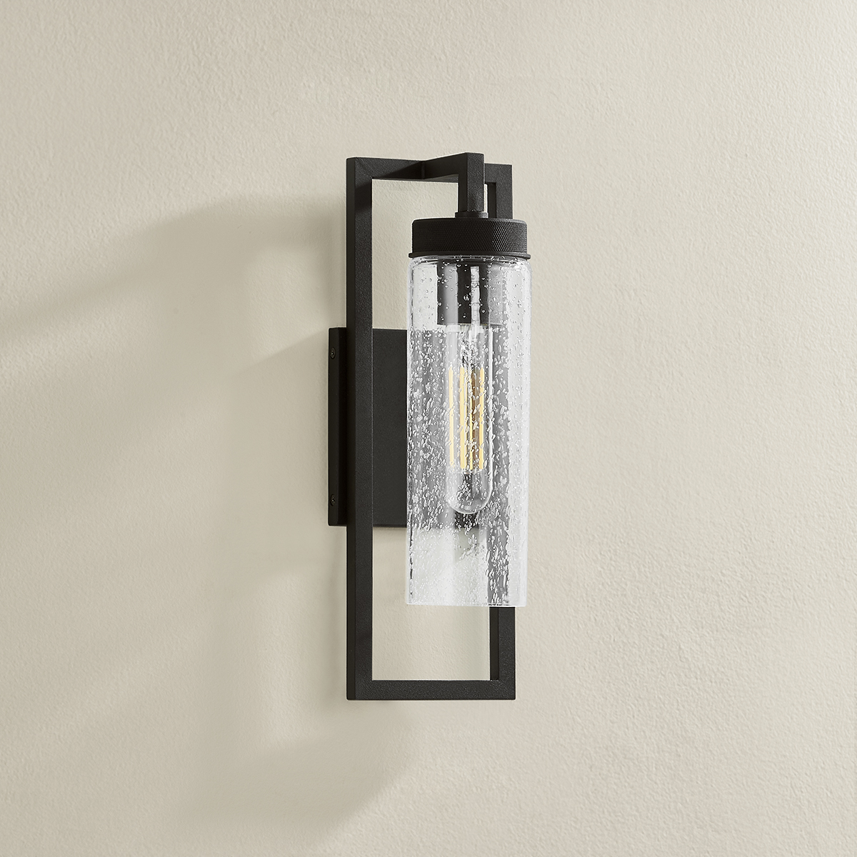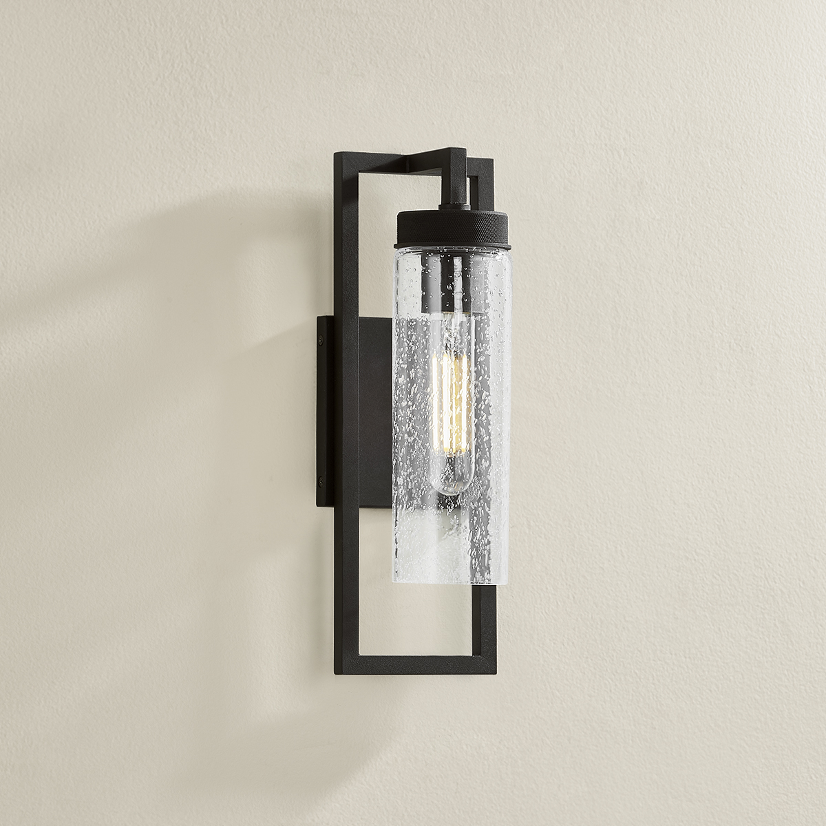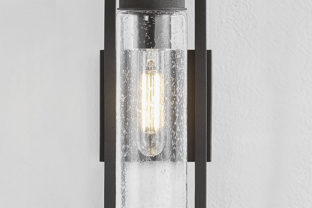 An expression of architectural geometry, Chester features a graphic composition with a pared-back silhouette and clean, bold lines. The sleek, industrial quality of the Textured Black frame is balanced by a Clear Seeded Glass cylinder that serves as a shade for the light source. Available in two sizes, this sconce adds understated style to modern exteriors.