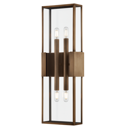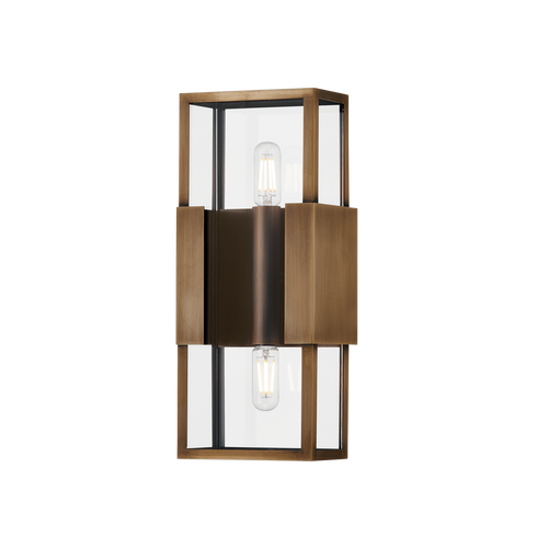 A refined interpretation of a vintage box lantern, Santa Clara focuses on maximizing the light and transparent feel of this piece while also celebrating the minimal Patina Brass metalwork. The flanges that extend from the backplate support the minimal glass box-like jewelry clasps. Available in two sizes featuring 2 lights each, as well as a 4-light version, this exterior wall light provides a warm welcome home.