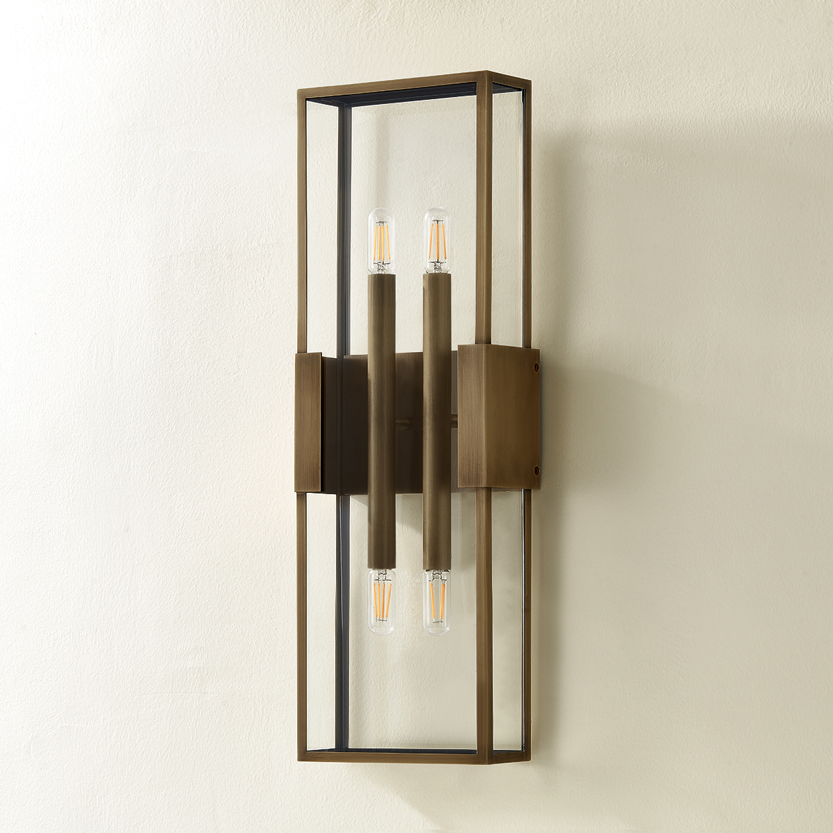 A refined interpretation of a vintage box lantern, Santa Clara focuses on maximizing the light and transparent feel of this piece while also celebrating the minimal Patina Brass metalwork. The flanges that extend from the backplate support the minimal glass box-like jewelry clasps. Available in two sizes featuring 2 lights each, as well as a 4-light version, this exterior wall light provides a warm welcome home.