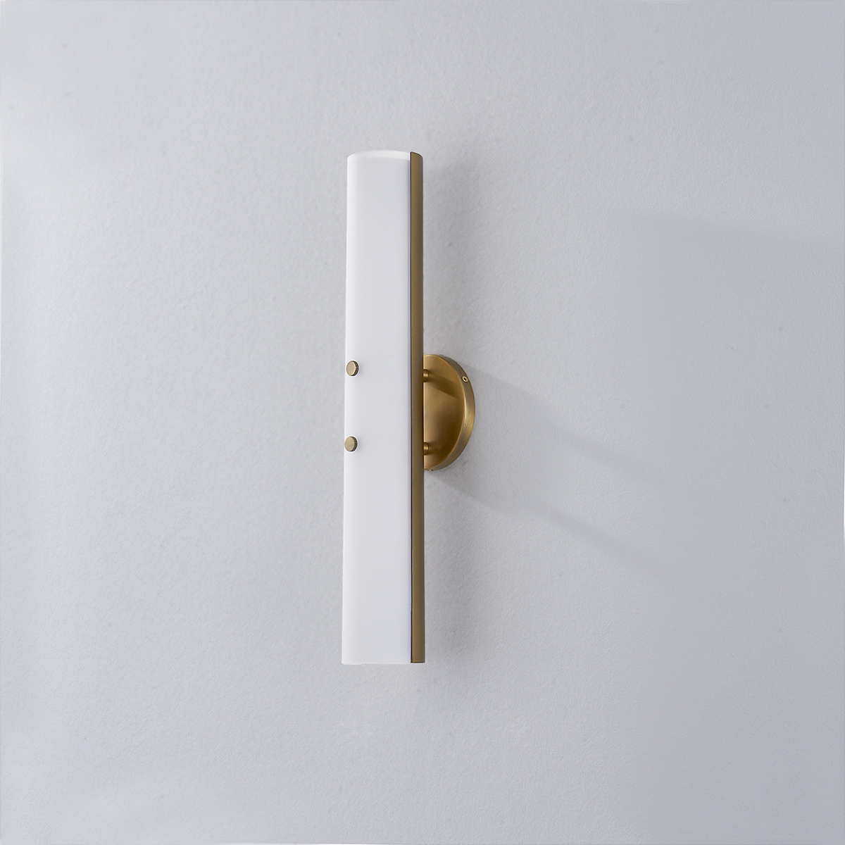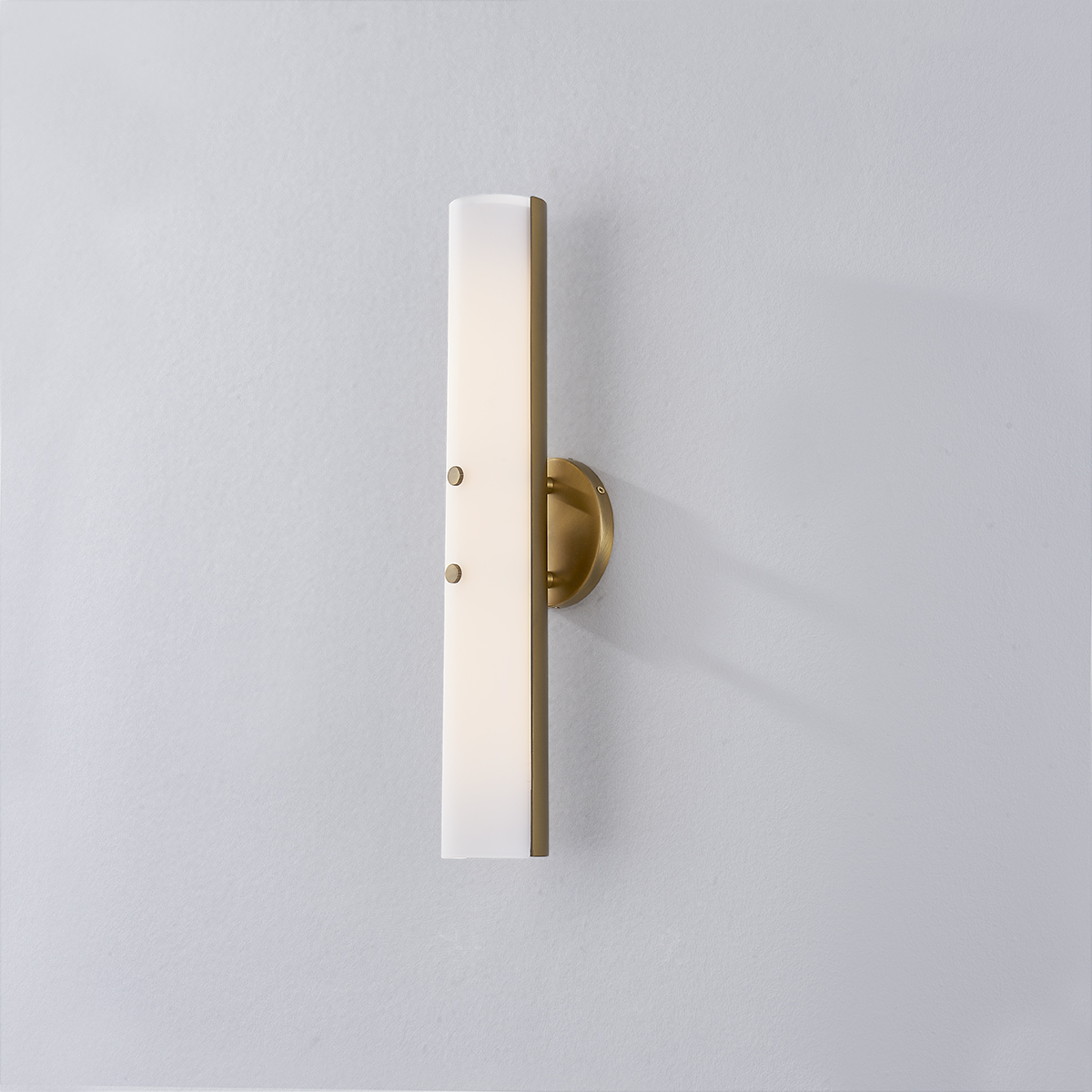 Slender, opal etched glass and metal tubes with jewelry-inspired accents give Titus its sleek, modern vibe. The three-light pendant and linear, both in Patina Brass and Soft Black, add a luxurious feel to any interior. The versatile one-light wall sconce comes in two sizes in both Patina Brass and Polished Nickel, and can be mounted horizontally or vertically.