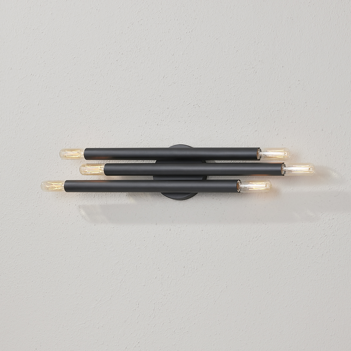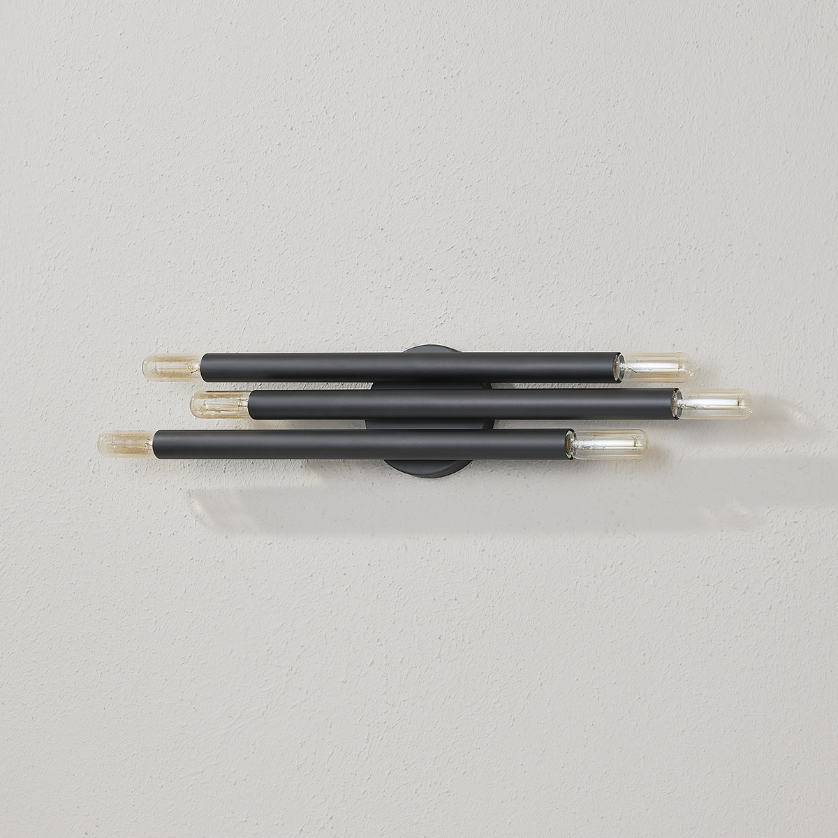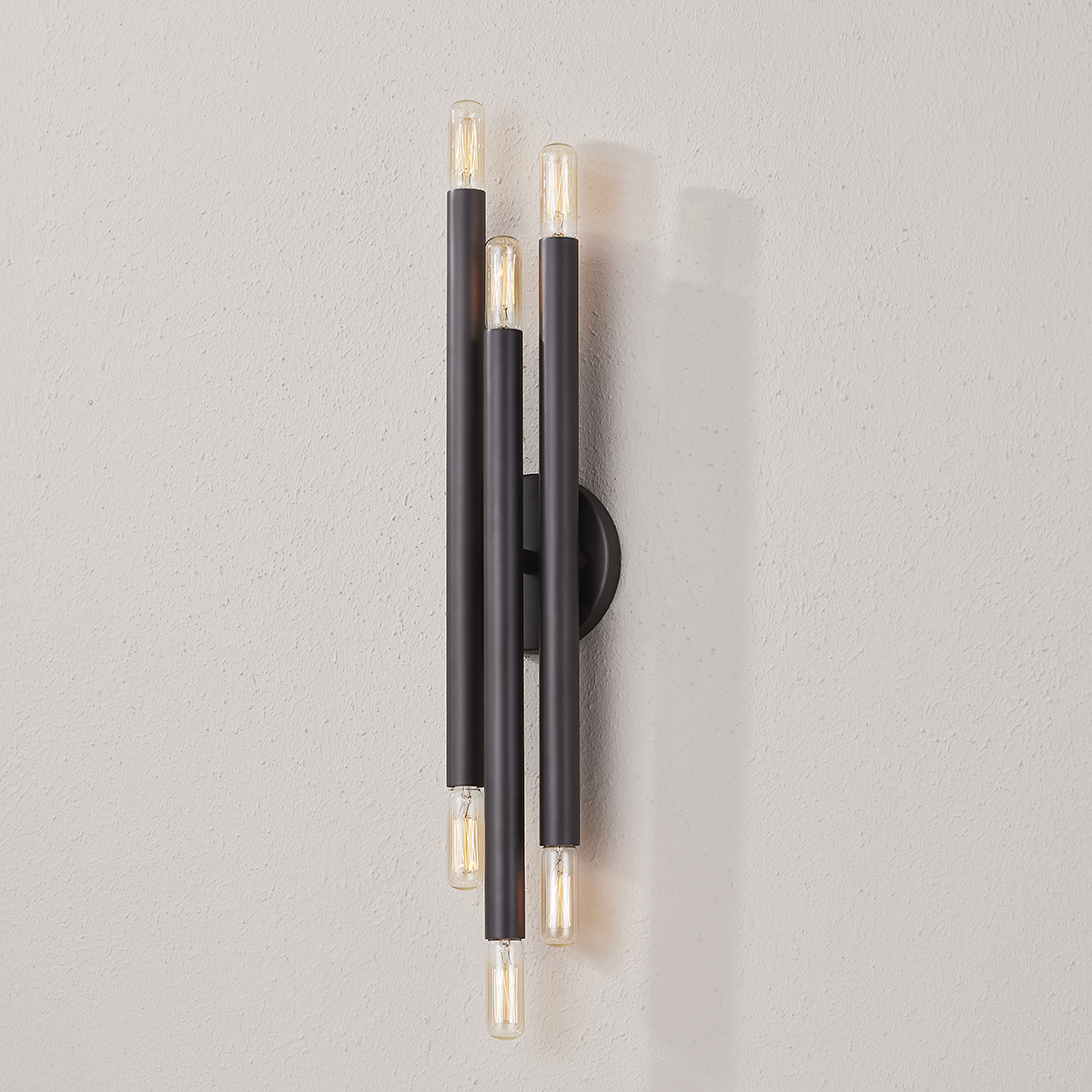 Streamlined, cylindrical metal shades are mounted at varying heights and depths from a circular backplate for a sleek and minimalist take on a mid-century modern silhouette. The variety of finishes (Patina Brass, Bronze and Polished Nickel) complement any interior, with the Polished Nickel working particularly well in a powder room or bath. This versatile six-light wall sconce can be styled horizontally or vertically.