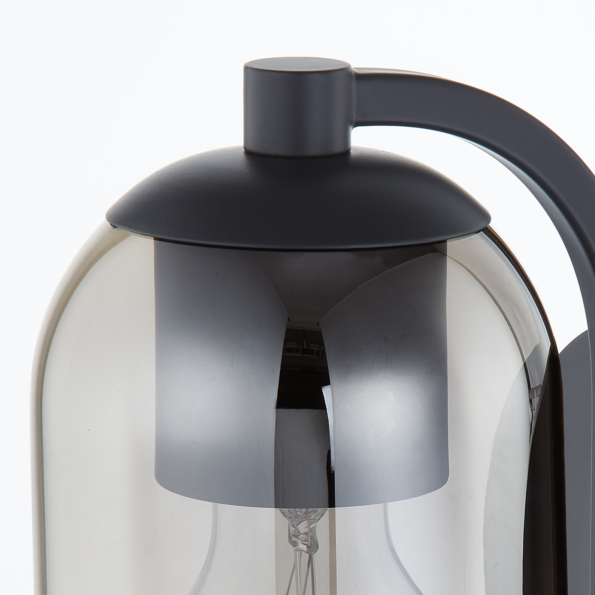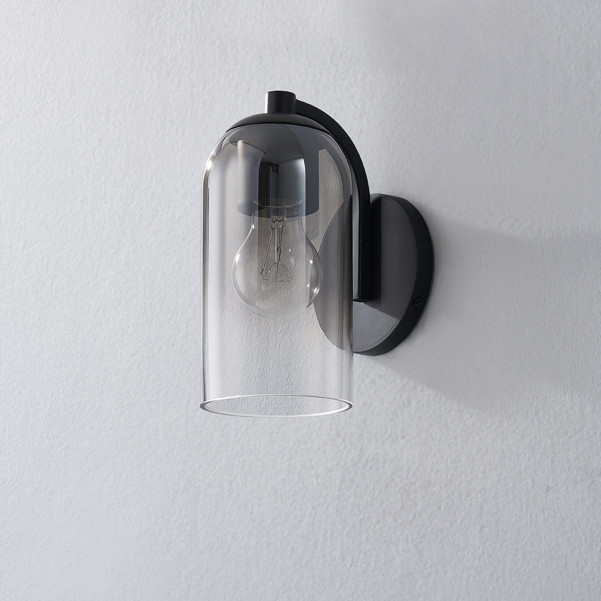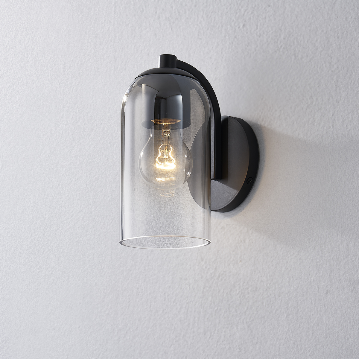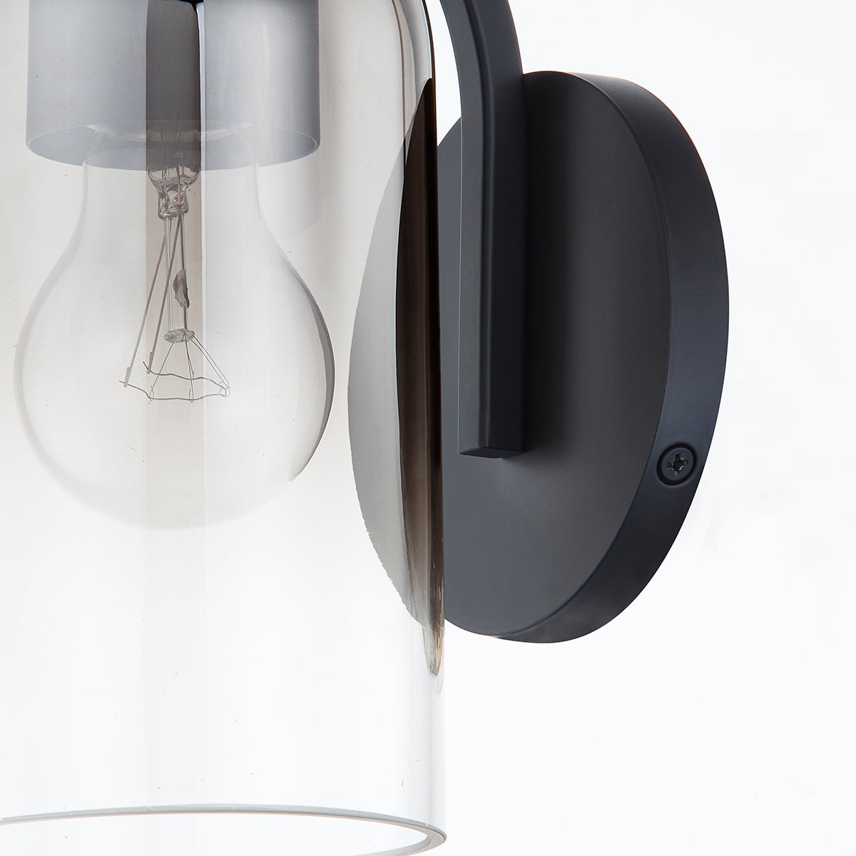 A rounded ombre glass shade is smoky at the top and transitions to clear as it covers the socket cup and bulb of this modern hurricane sconce. The shade cap, curved arm and round backplate, all in a Soft Black finish, keep with Maverick's clean look.