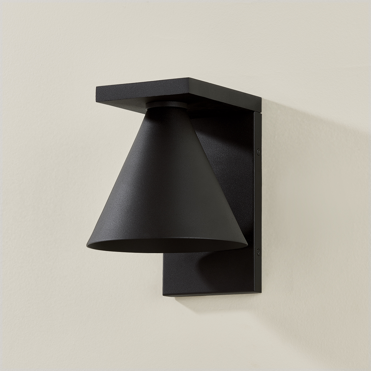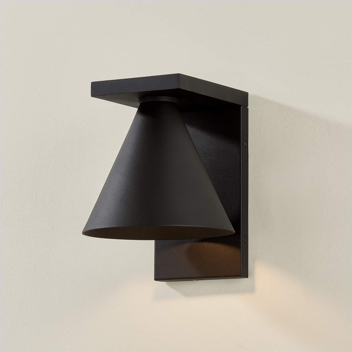 A conical shade is suspended like a bell from an L-shaped backplate in the streamlined Sean. The minimalist construction of the sconce, paired with an all-over Textured Black finish, creates a versatile and highly functional fixture for exterior use. Available in two sizes, Sean is designed to comply with Dark Sky requirements, prioritizing a reduction of light pollution.