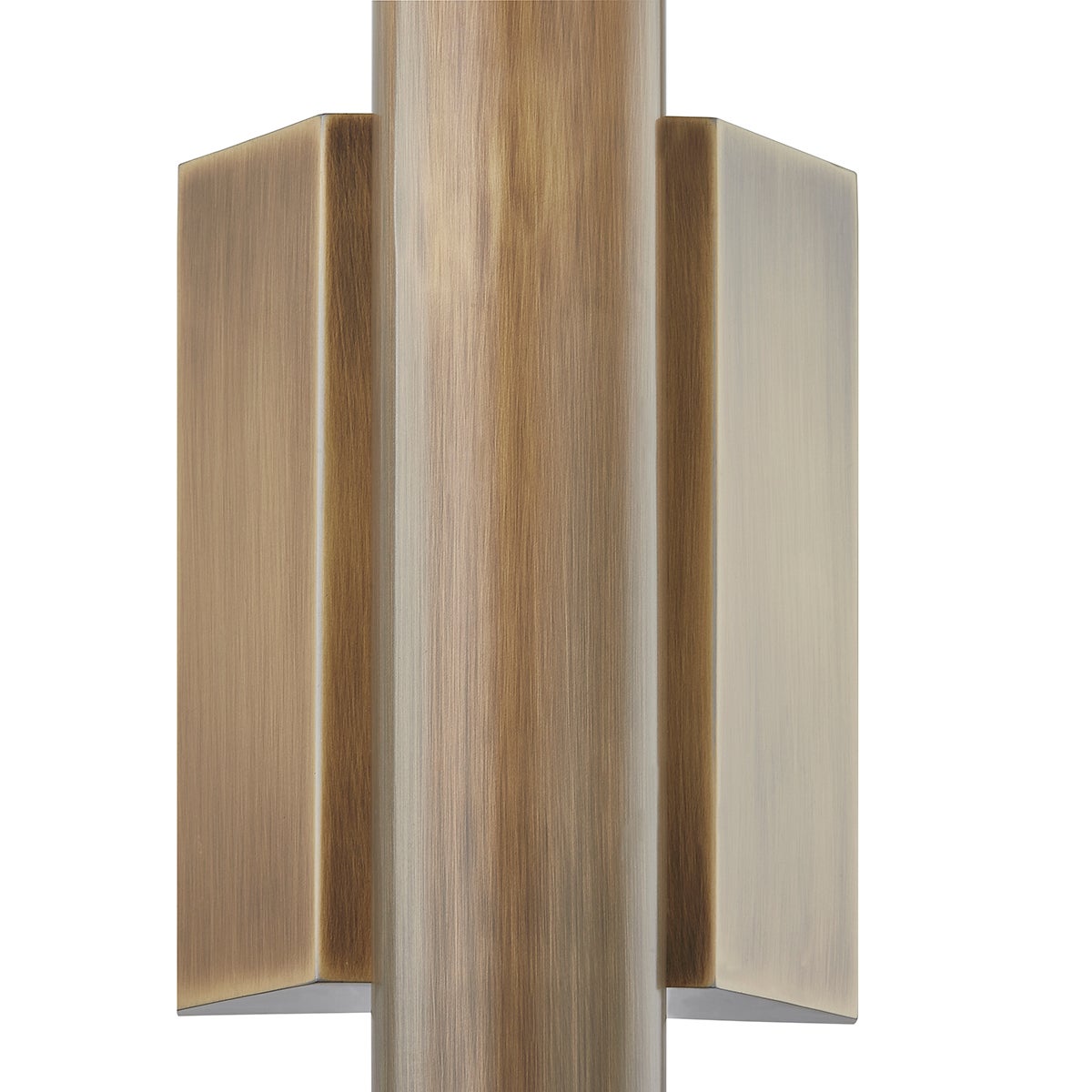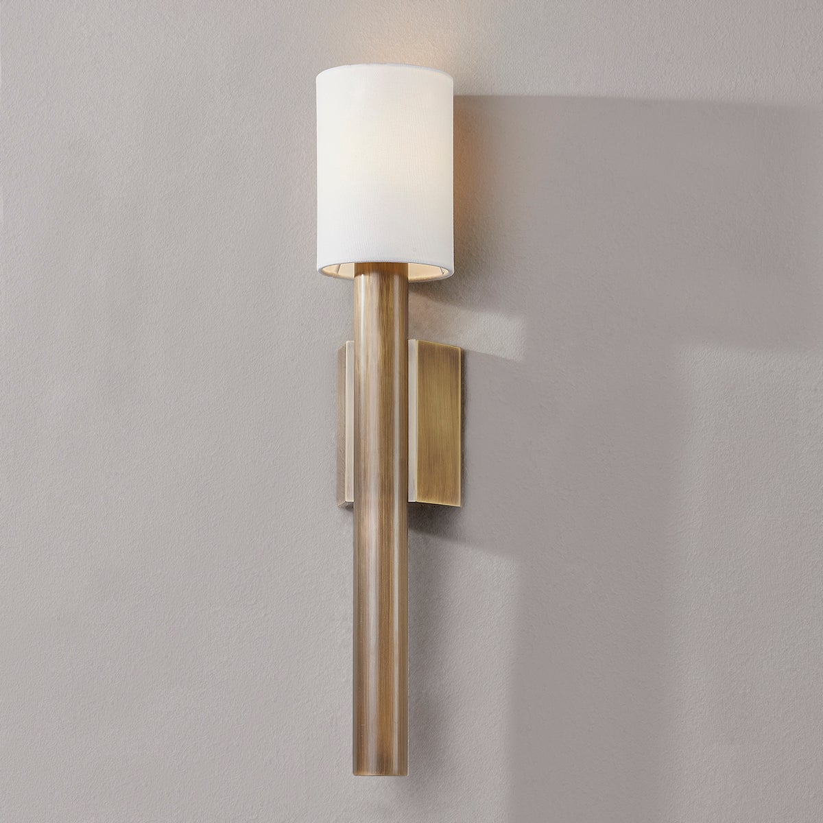 A chunky rod-shaped arm of Patina Brass rests between a unique wedge-like backplate for a bold modern look that is also very usable. The thick metalwork takes this design from straightforward to statement-making and the off-white linen shade adds softness.