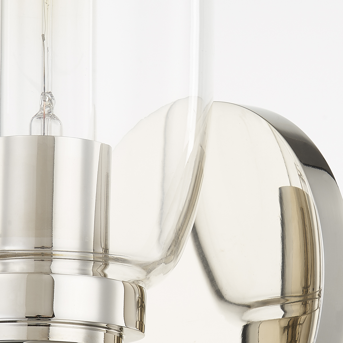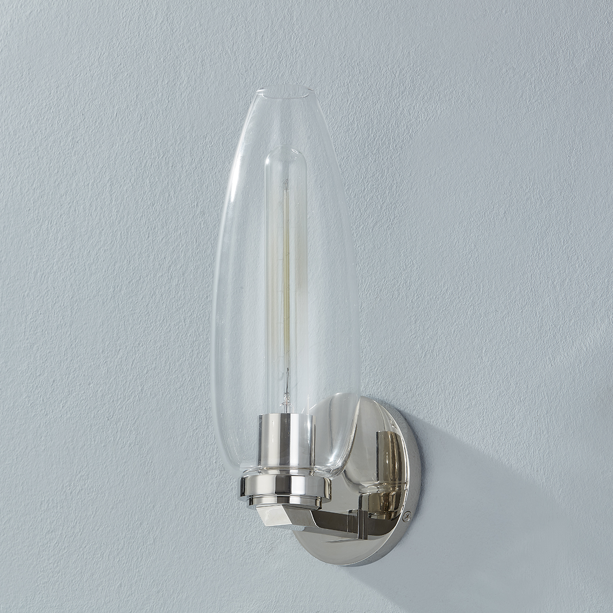 A tulip-shaped clear glass shade forms a lantern-like covering over a tubular bulb for a timeless look with clean, modern lines. Both the Patina Brass and Polished Nickel finish make this extremely usable wall sconce suitable for many styles and spaces.