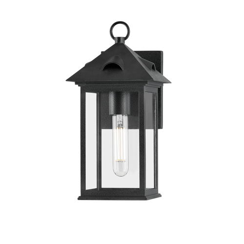 Finished in Forged Iron, this classic lantern melds old-world charm with contemporary functionality. The simplified design features four panels of clear glass encasing one or two candles while emphasizing negative space. Rounded roof vent details contribute to the heritage feel of the design. Available in four sizes, Corning suits a number of design styles, from bright cottages to farmhouses and colonial exteriors.