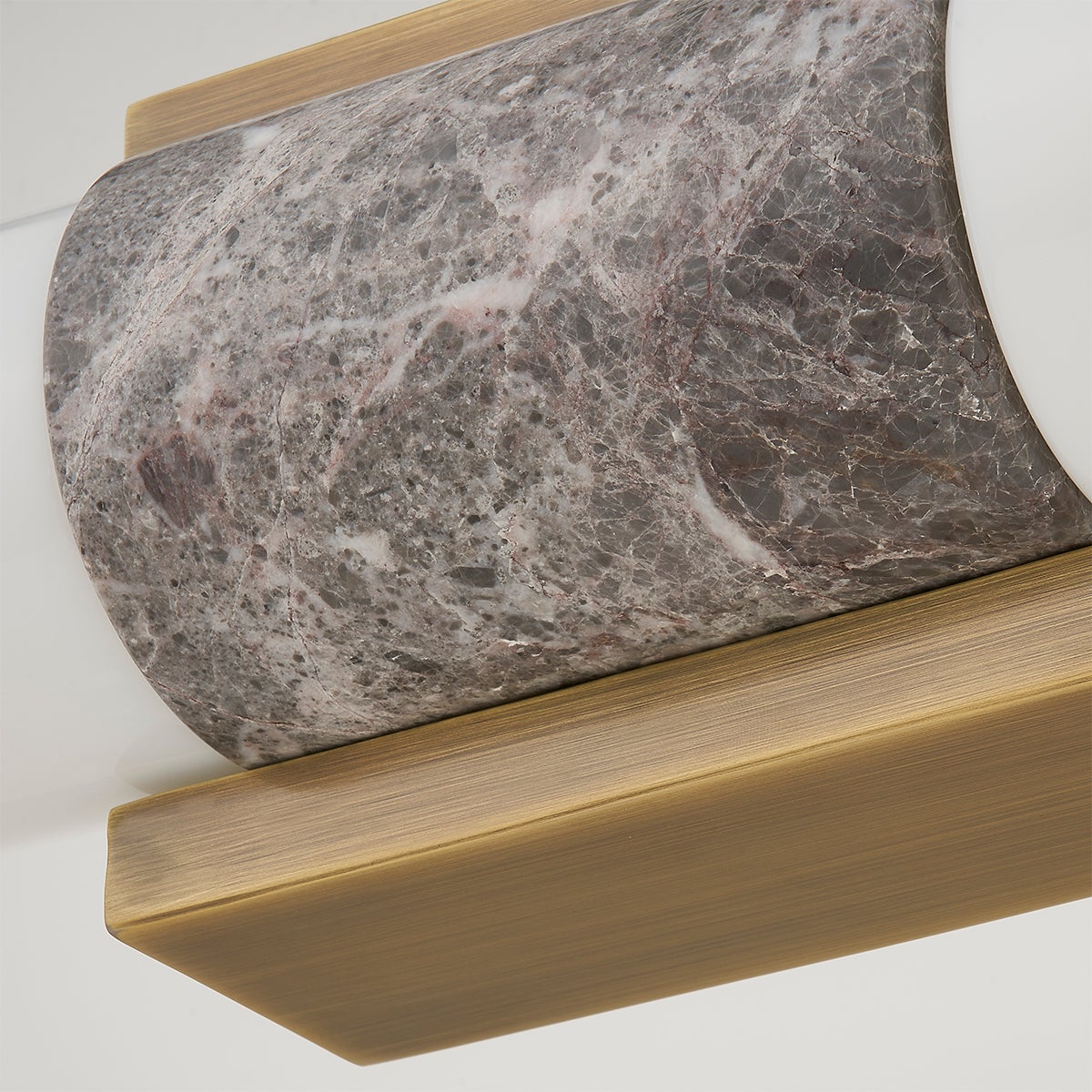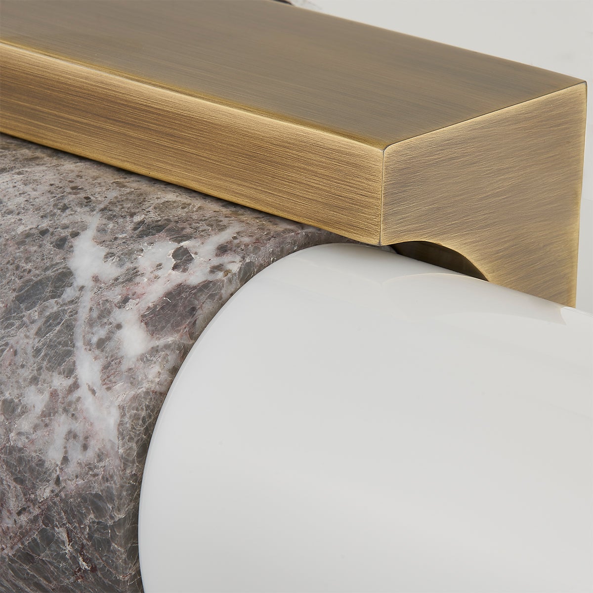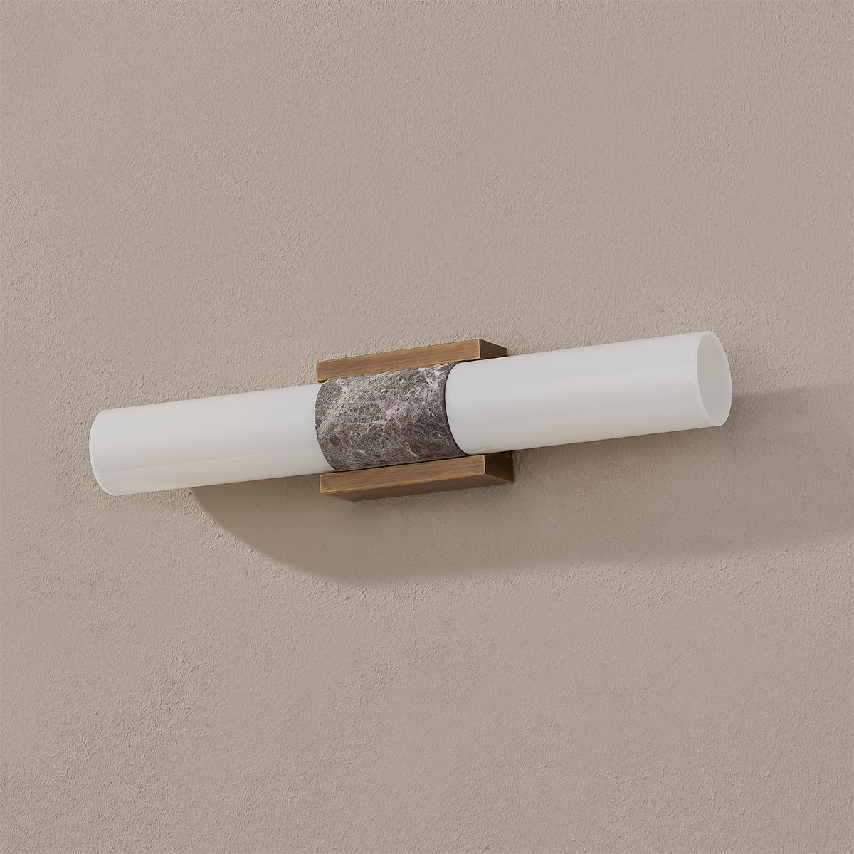 A cylindrical opal glossy glass shade with a band of grey marble is held in place by a protracted backplate of Patina Brass making Fremont feel unexpected and sophisticated. This wall sconce has a different yet designer aesthetic that makes it usable and unique at the same time. The two-light sconce can be mounted vertically or horizontally.