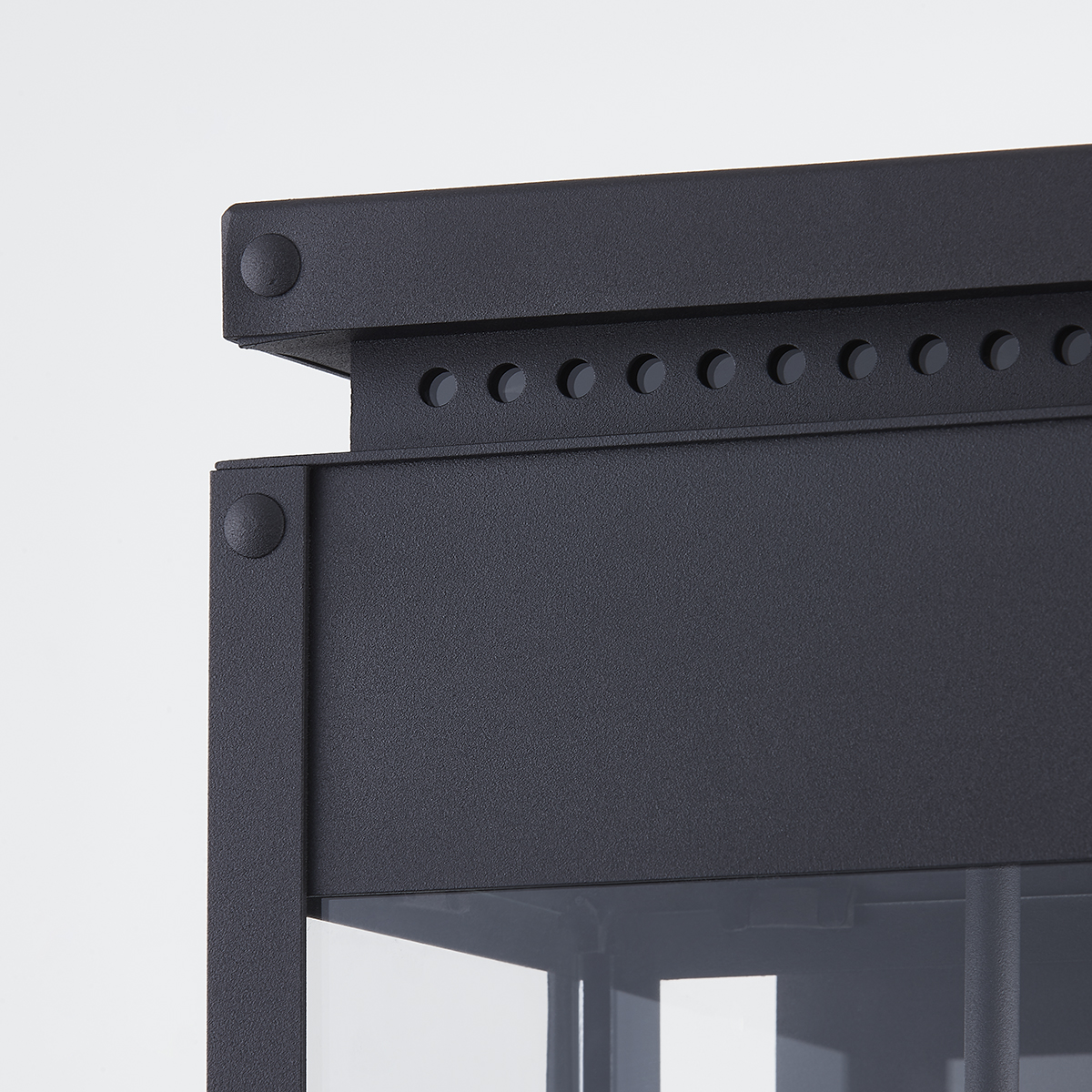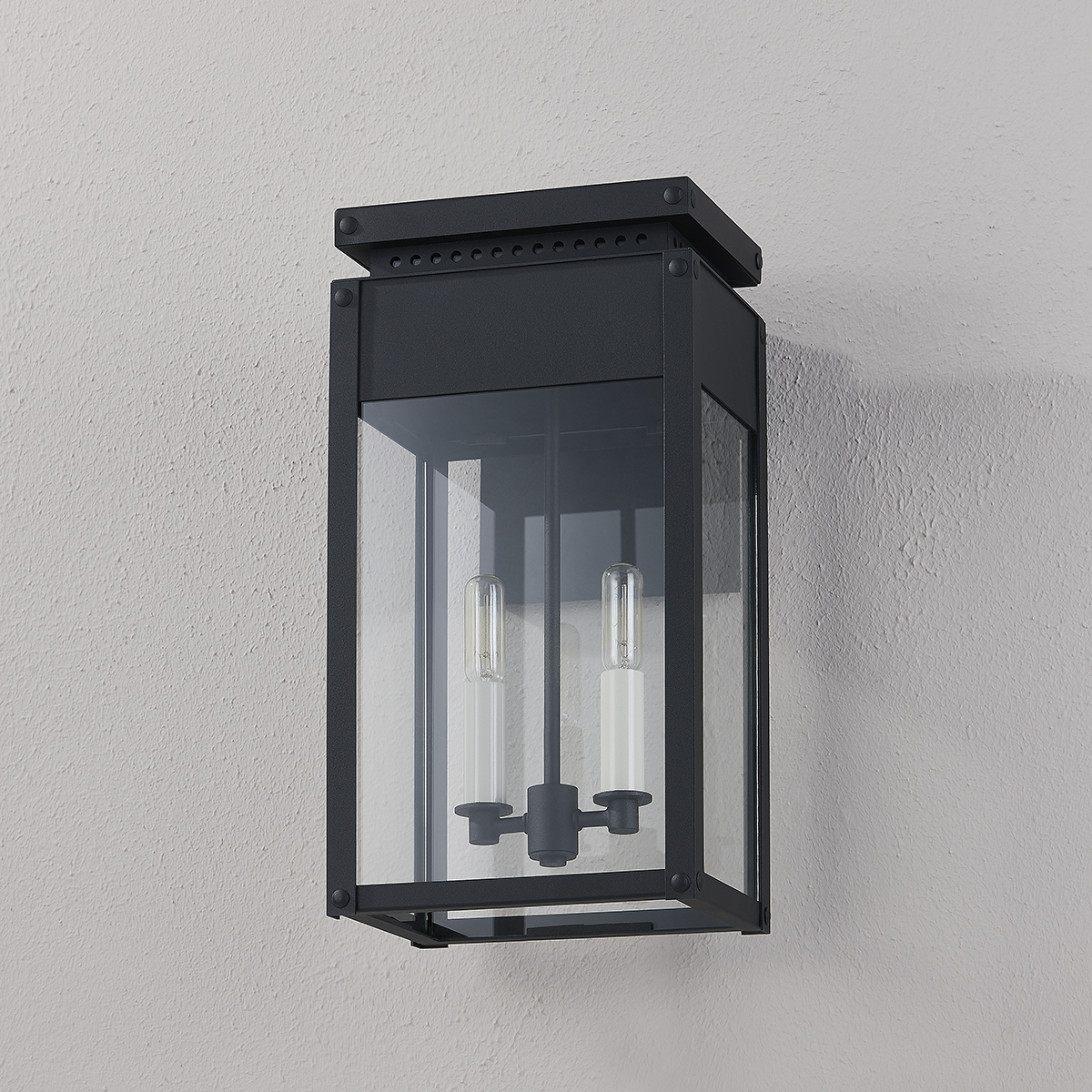Braydan features a Texture Black metal framework with visible hardware and a perforated, roof-like accent, adding a craftsman touch to the traditional lantern design. With one-, two- or three-light size options, this stately sconce will find a home in many exteriors.