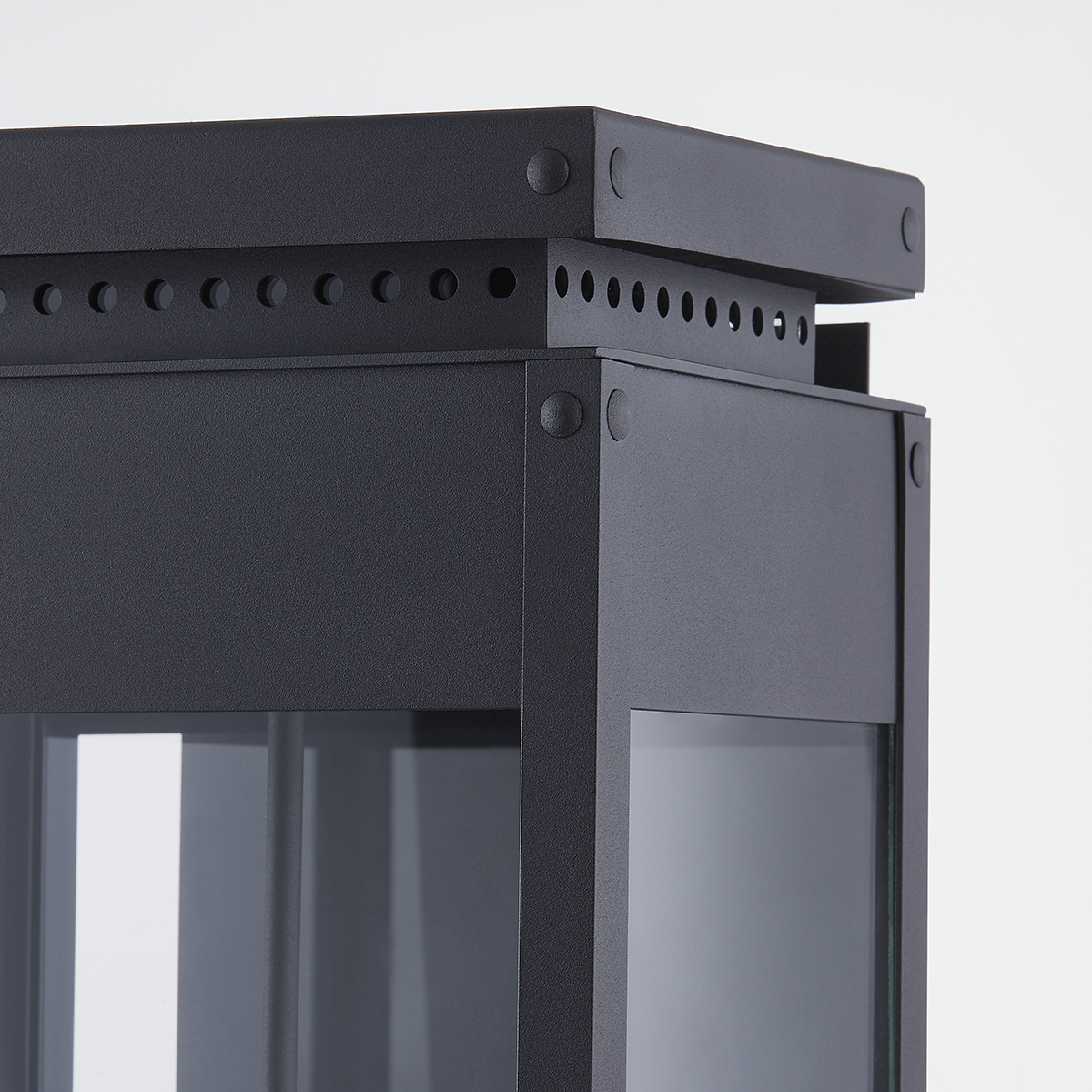 Braydan features a Texture Black metal framework with visible hardware and a perforated, roof-like accent, adding a craftsman touch to the traditional lantern design. With one-, two- or three-light size options, this stately sconce will find a home in many exteriors.