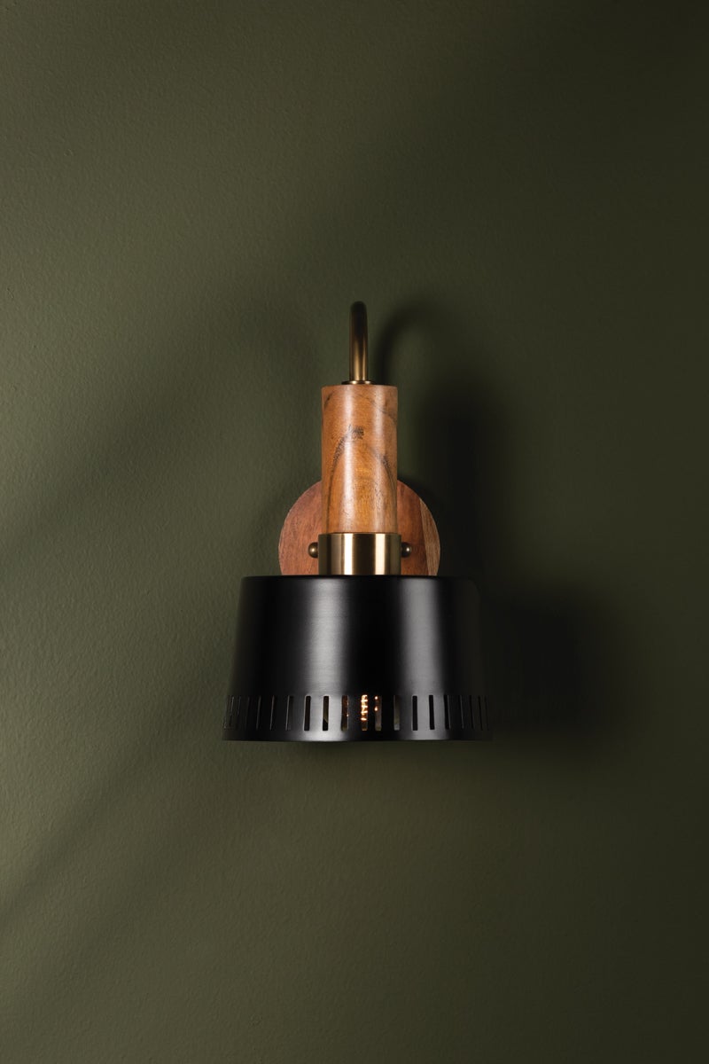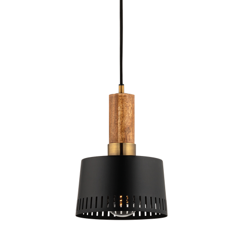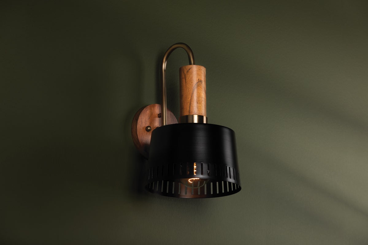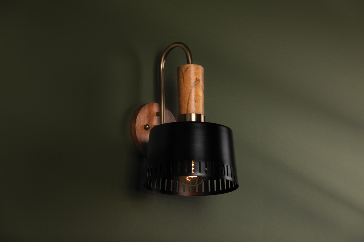 With a nod to mid-century modern, Mephis is a beautiful mix of materials and textures. A perforated soft black metal drum shade is complemented by acacia wood details and patina brass hardware. Both the pendant and the wall sconce work well styled alone in smaller spaces or in multiples in larger areas.