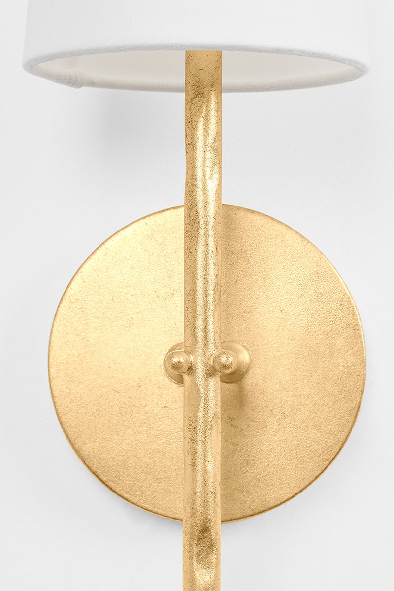 Tapered white linen candlesticks are gently held in place between a pair of horizontal arms, taking River's straightforward, recognizable silhouette to the next level. The hammered Vintage Gold Leaf metalwork adds movement and gives this one-light sconce and six- or nine-light chandelier design a rich, natural look that stands out.