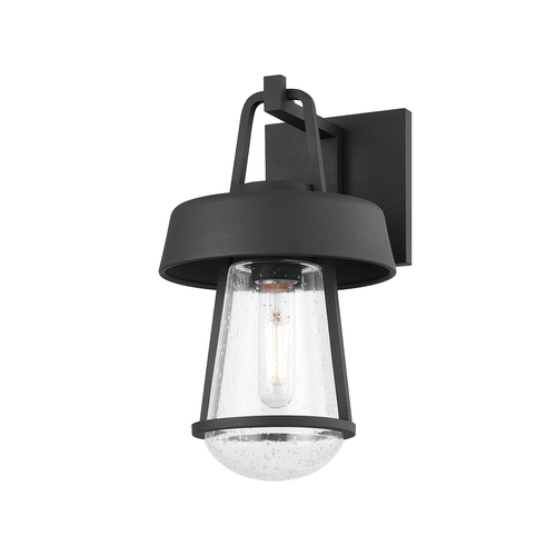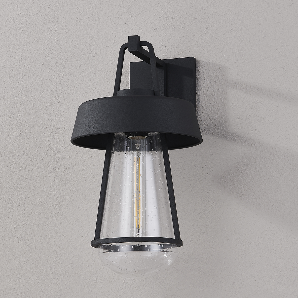 A clear glass shade rests within a Texture Black metal framework. The clean lines and smooth silhouette make a modern statement. Available as a one- or two-light option, Brady is a stylish way to add a warm glow to a variety of outdoor spaces.