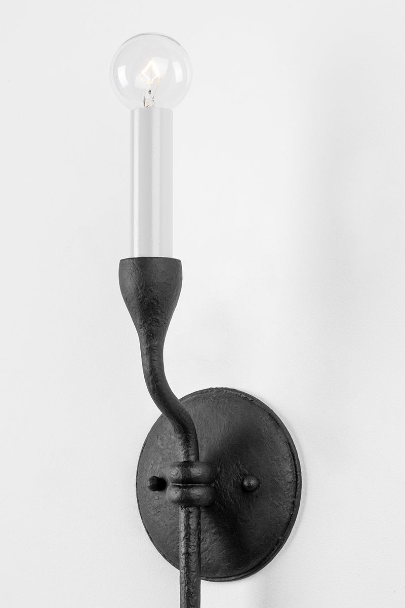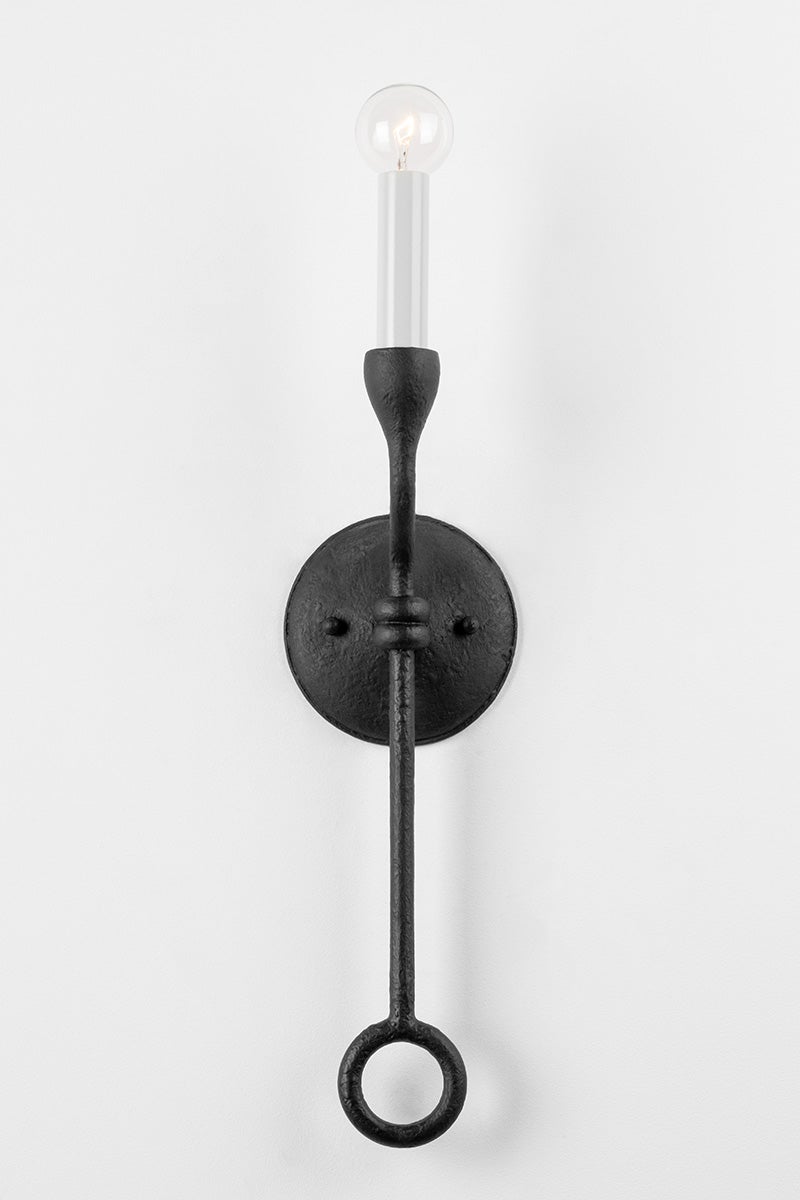 Linear arms extend from a totem-stacked coil center to hold candlesticks creating Orson's elongated, dramatic silhouette. Simple loop accents and textured Black Iron or Vintage Gold Leaf metalwork add to the sleek design. Make a stunning, modern statement throughout the home with the one-light wall sconce, six- or eight-light chandelier and four-light island fixture.