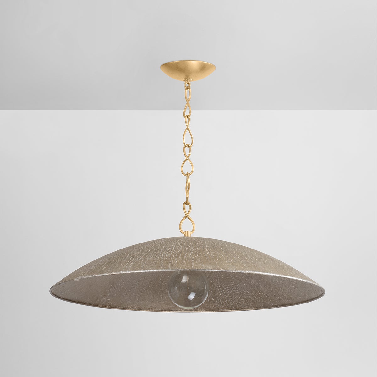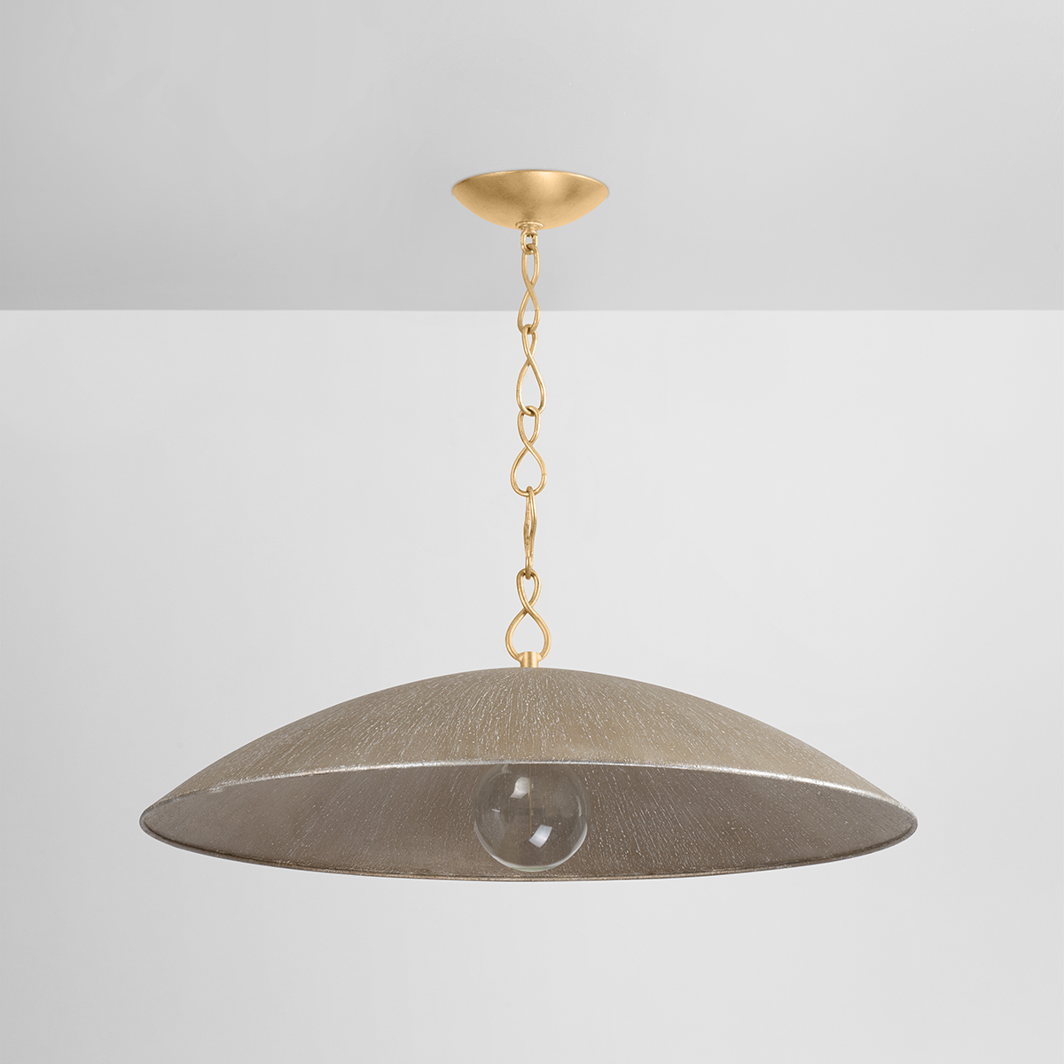 With a sculptural dome shape and thoughtful materiality, Eve embodies a purity of design. The Textured Warm Silver Leaf creates a stylish finish that feels organic and fresh. In both available sizes, this pendant light creates an impact with its warm glow and understated elegance. Part of our Becki Owens collection.