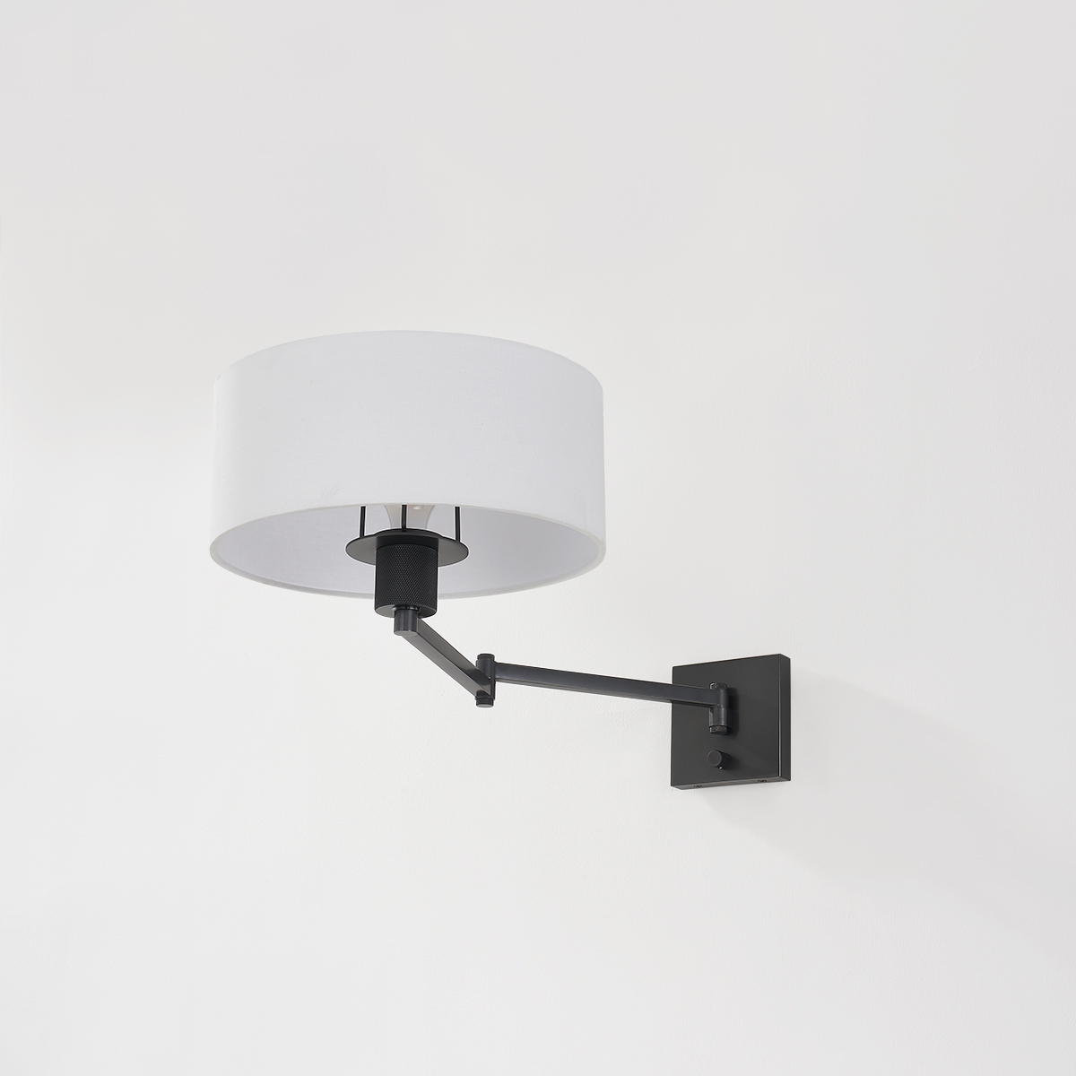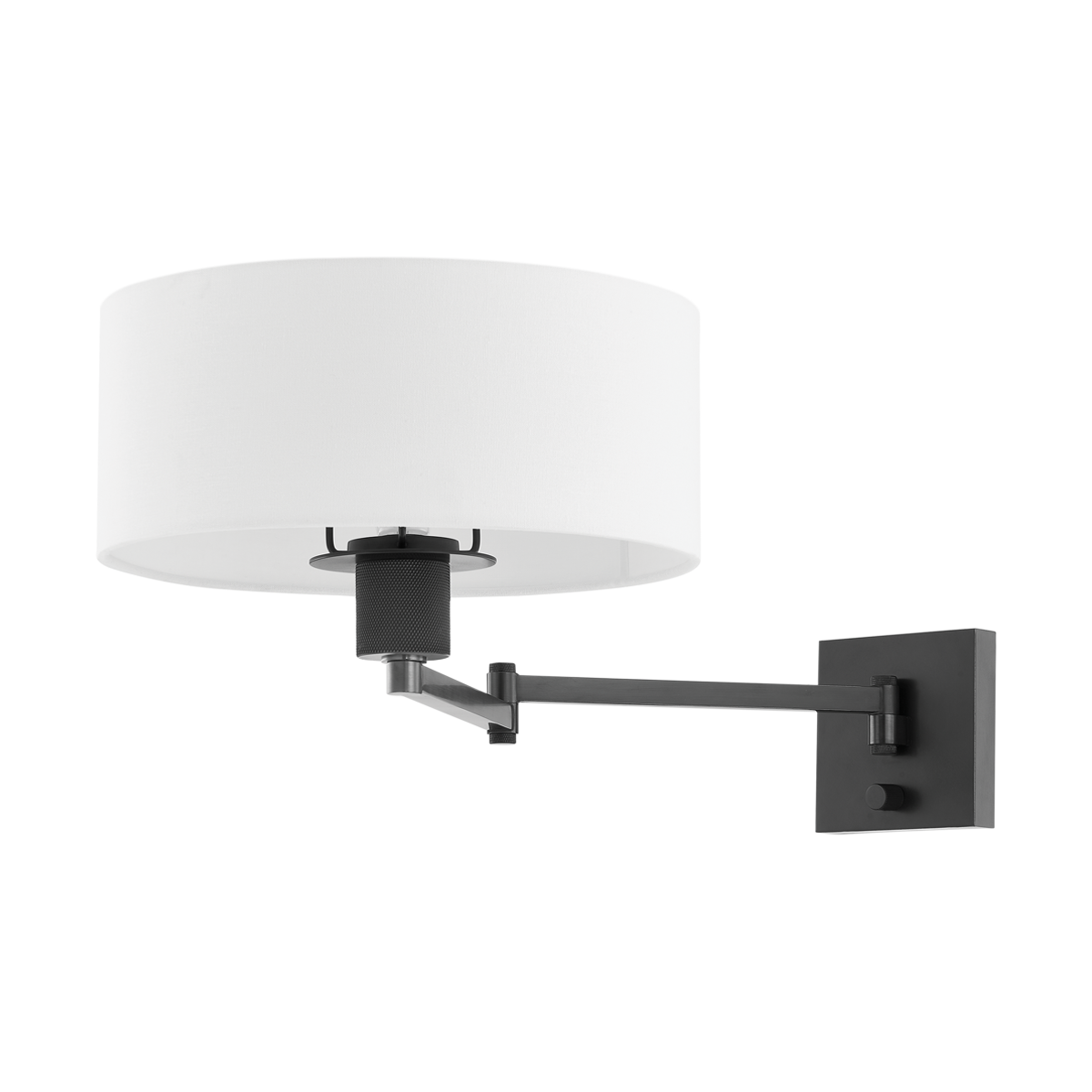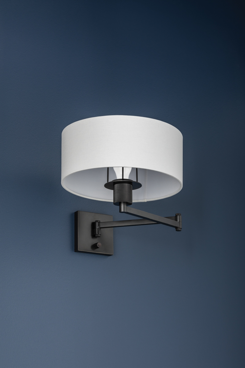 Form meets function in this user-friendly sconce design. A large drum shade in crisp white linen tops an adjustable swing arm, allowing for ease and versatility. With its lamp-like silhouette, it�s a favorite for reading in bed. This useful wall light comes in two finishes; Aged Brass and Old Bronze. Part of our Becki Owens collection.