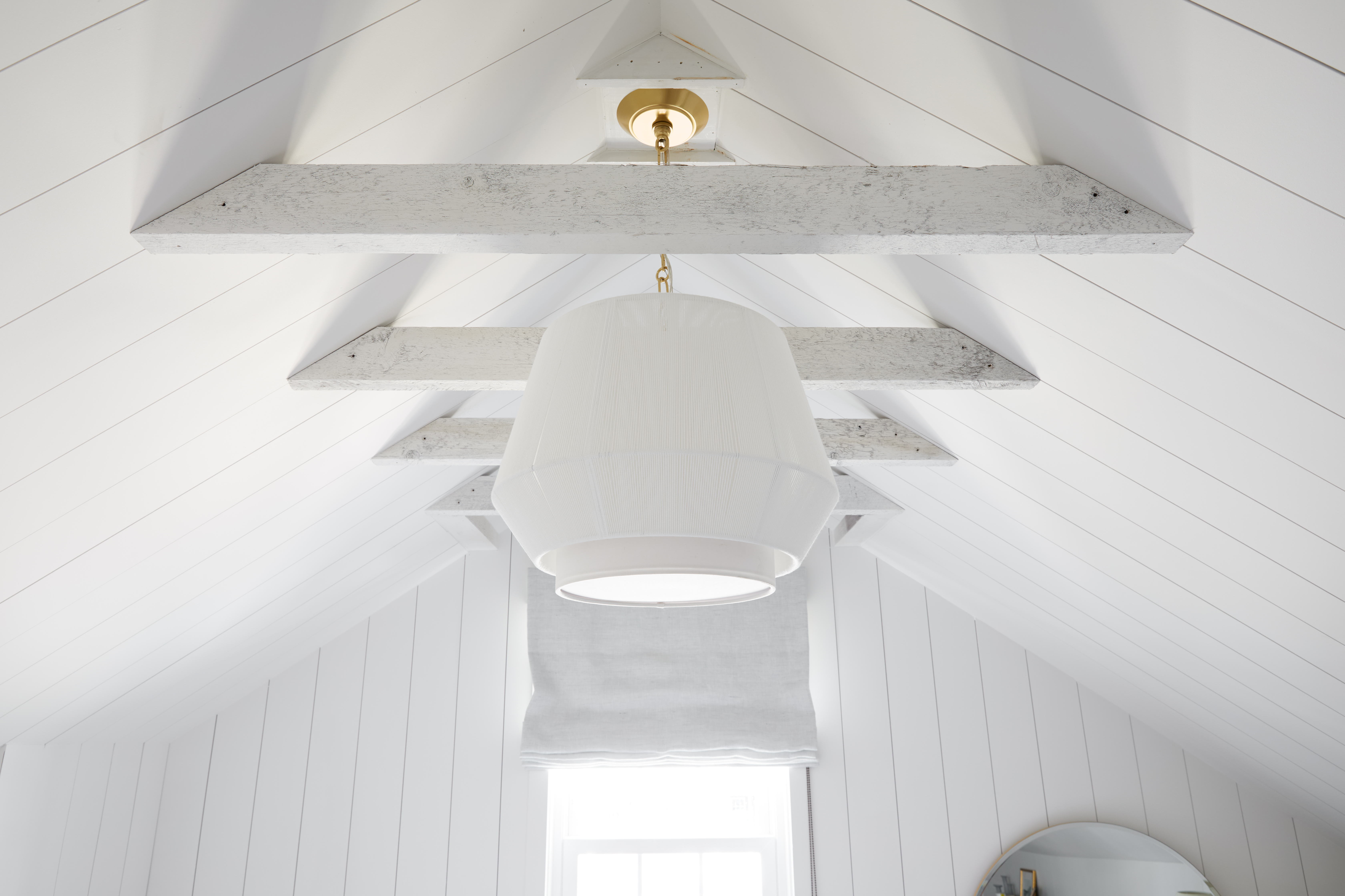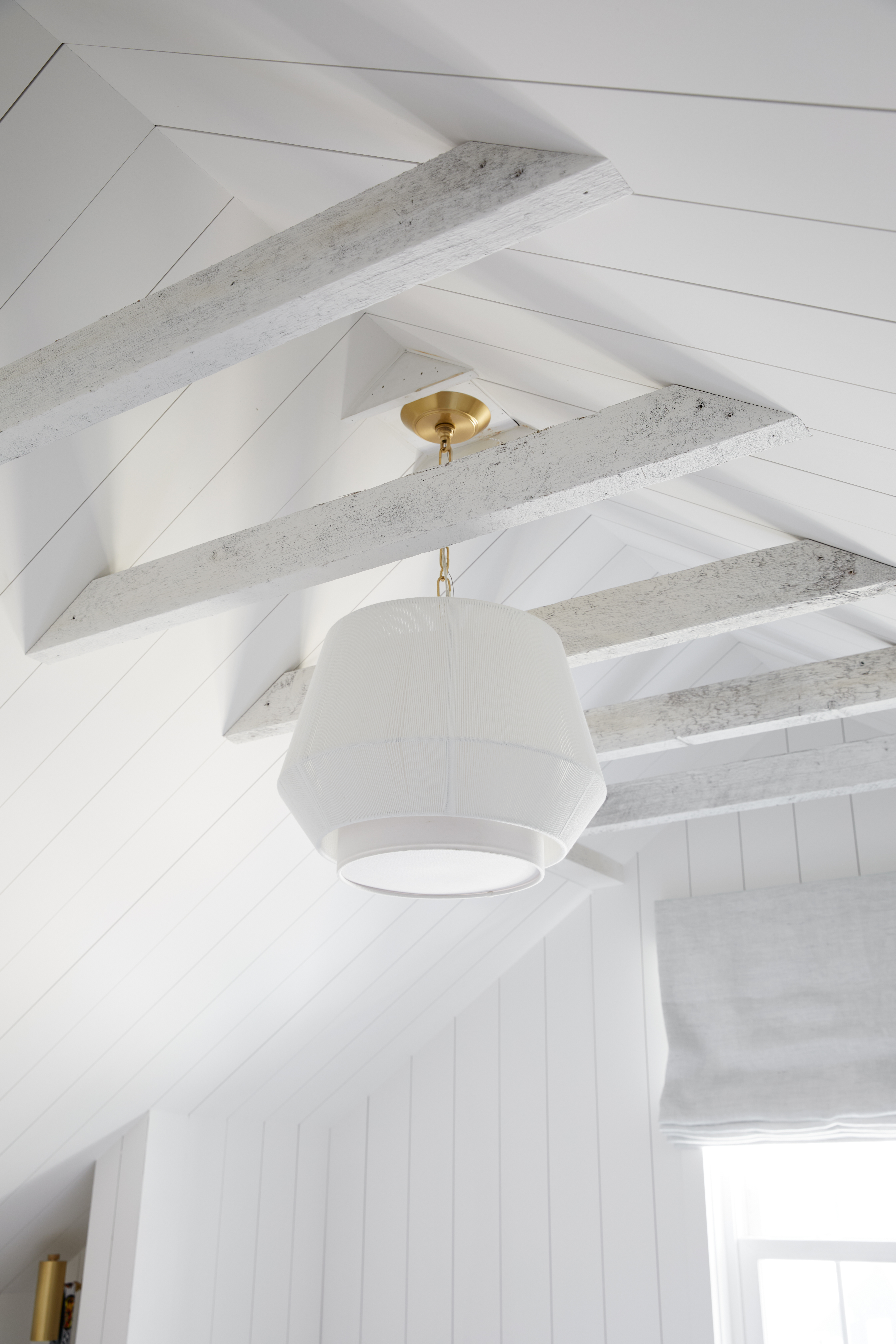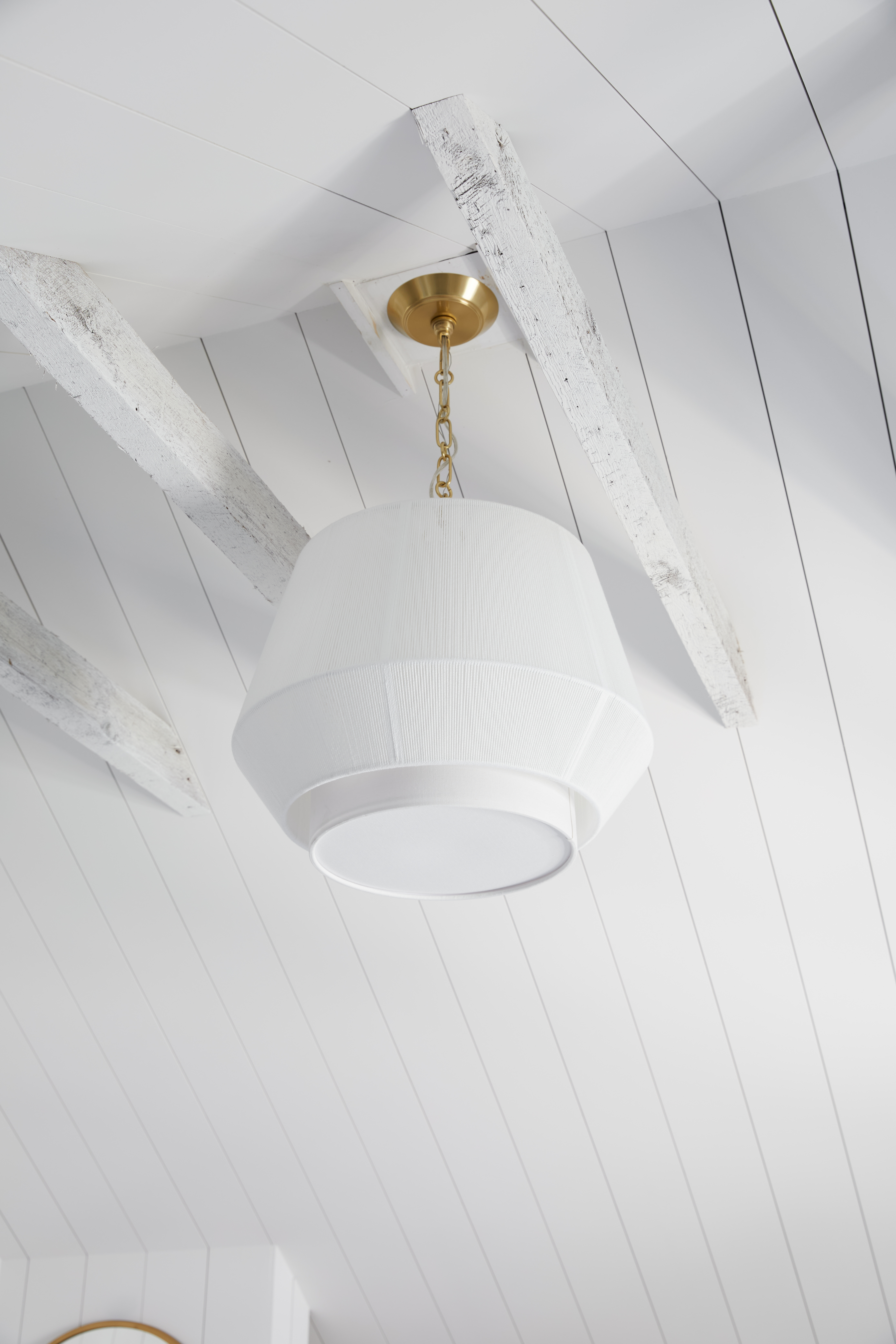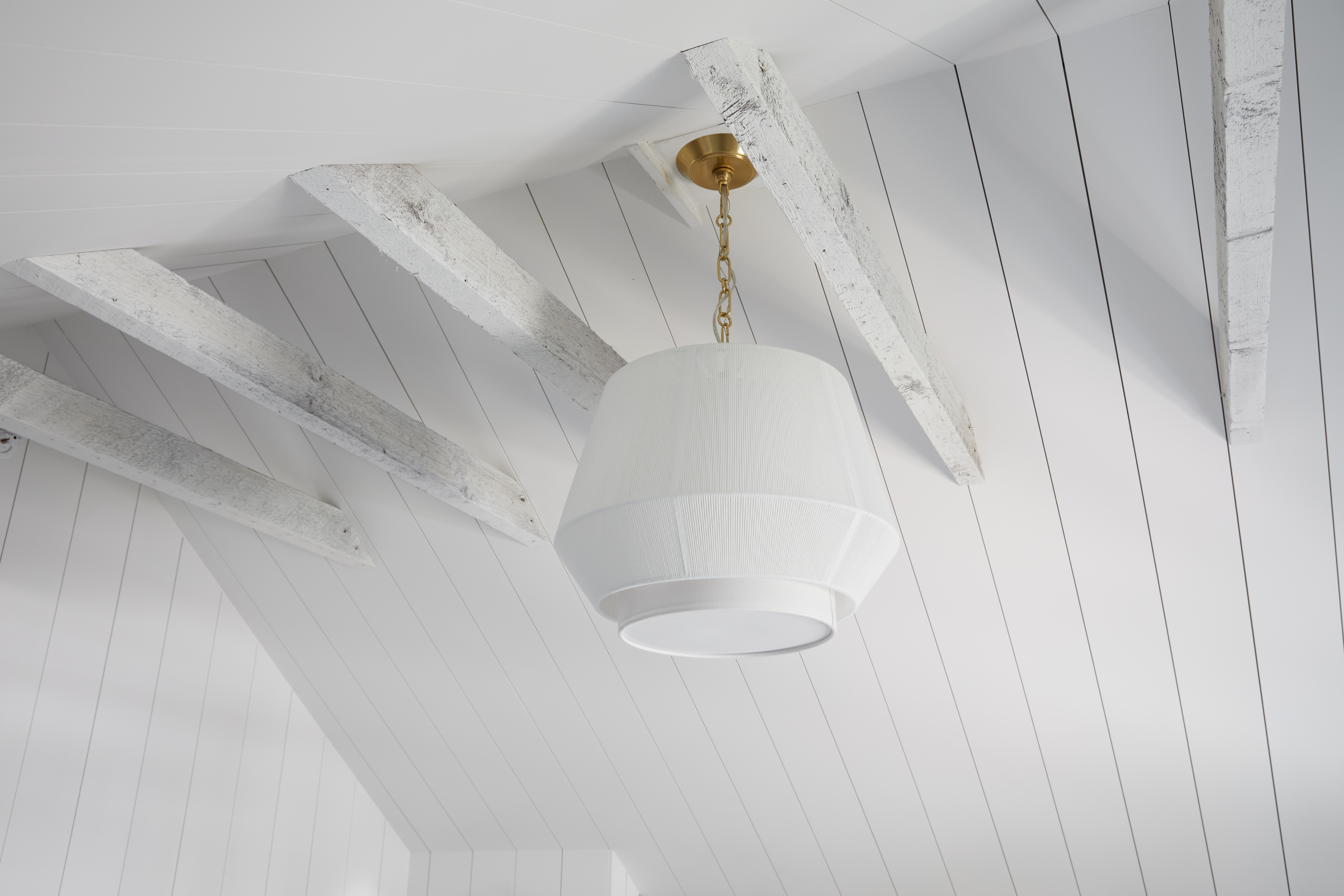 Debi plays with layers, texture, and tone to reveal a multi-dimensional silhouette. A linen drum shade serves as the base, creating a column of light shining below. Clean and crisp on its own, the shade is then fitted with a metal frame that is wrapped delicately in linen strings. Aged brass accents give the monochromatic shade a touch of glamour, finishing off this dynamic design.