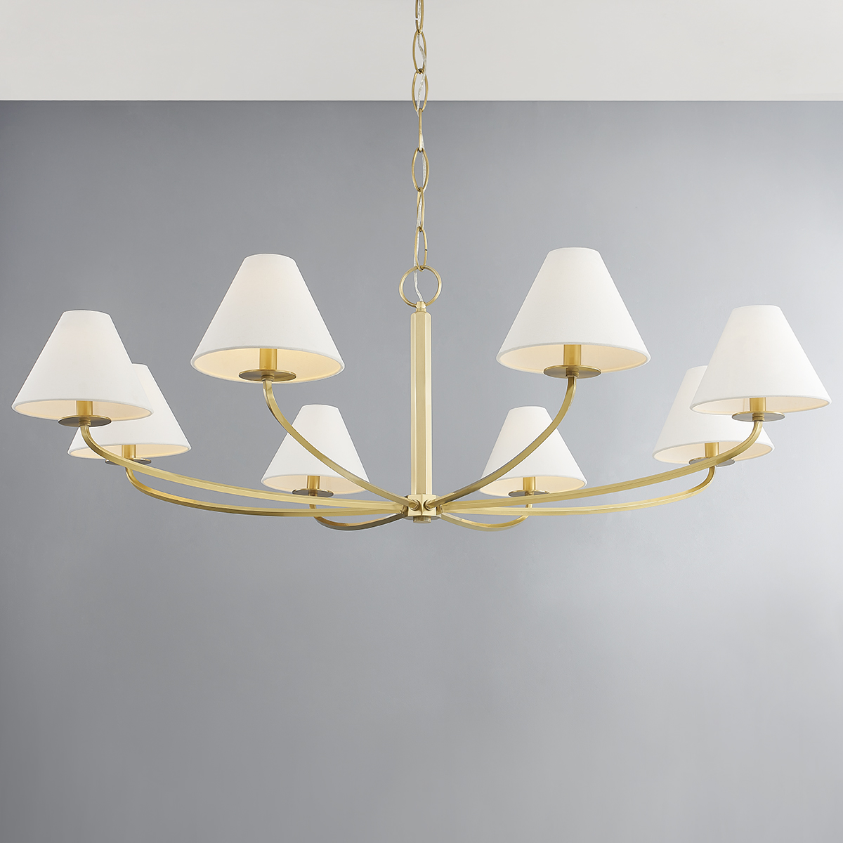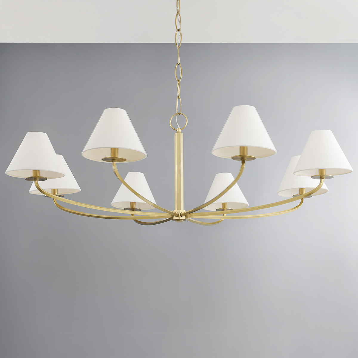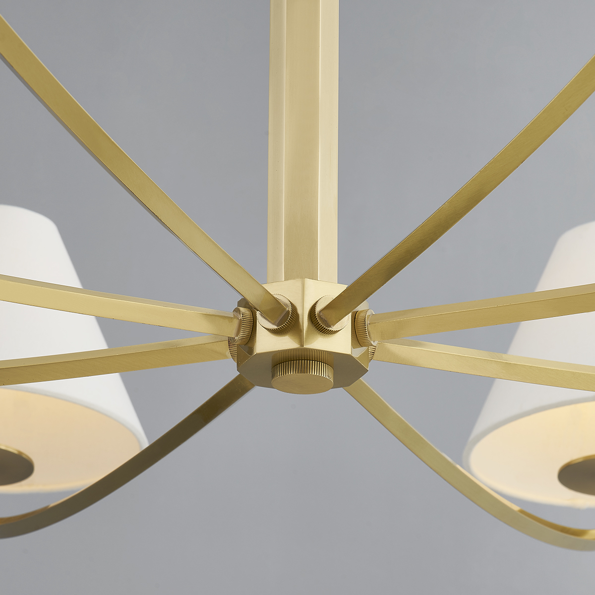 At first glance, Stacey is your classic shaded fixture, but a closer look reveals a familiar silhouette with subtle elevated details. In sconce form, a layered circular backplate with bias cut edge detailing is the base for a swooping square arm that slightly twists into knurled caps at either end. The chandelier highlights the same bias cut technique in an elegant stem. Stacey's stunning metalwork is available in three classic finishes.