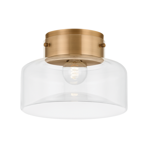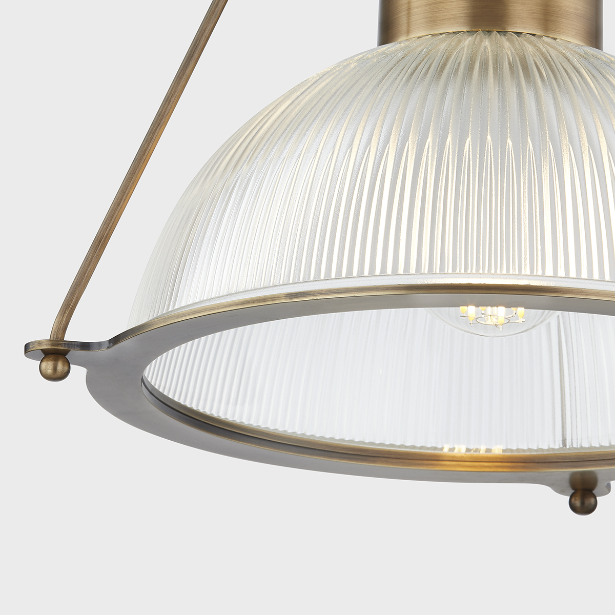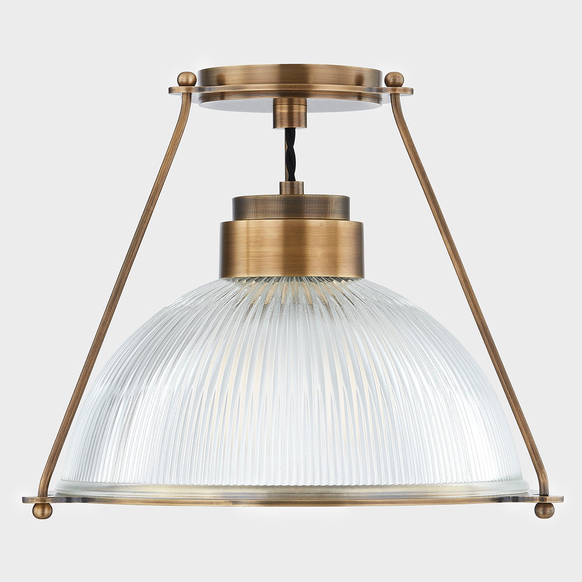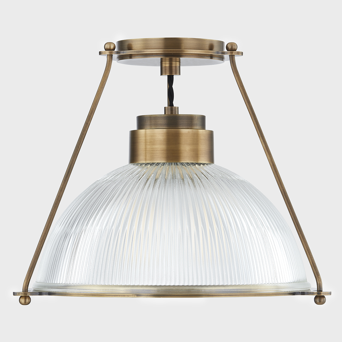 Industrial design with a modern edge, Glint features a dome shade of ribbed Holophane glass suspended from the ceiling within a unique Patina Brass framework. The twisted black fabric cord near the canopy adds a subtle vintage feel. This striking semi-flush mount makes a gorgeous statement close to the ceiling. Part of our Lauren Liess collection.