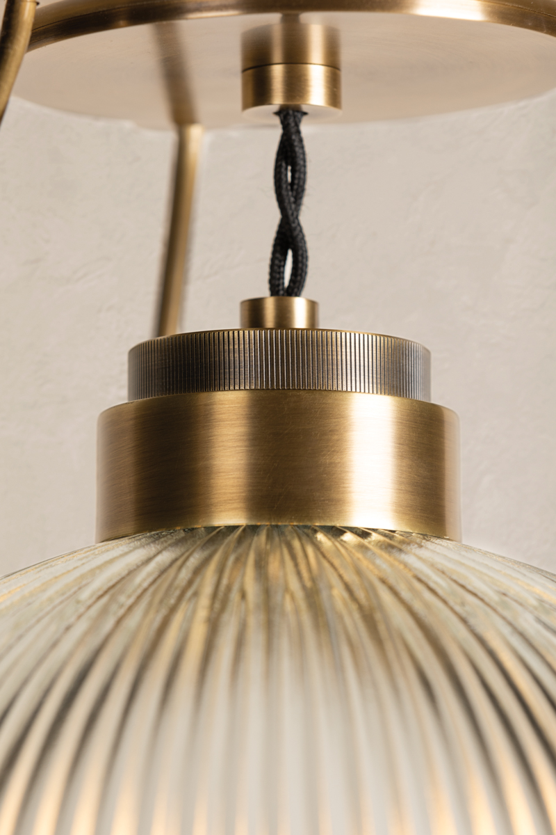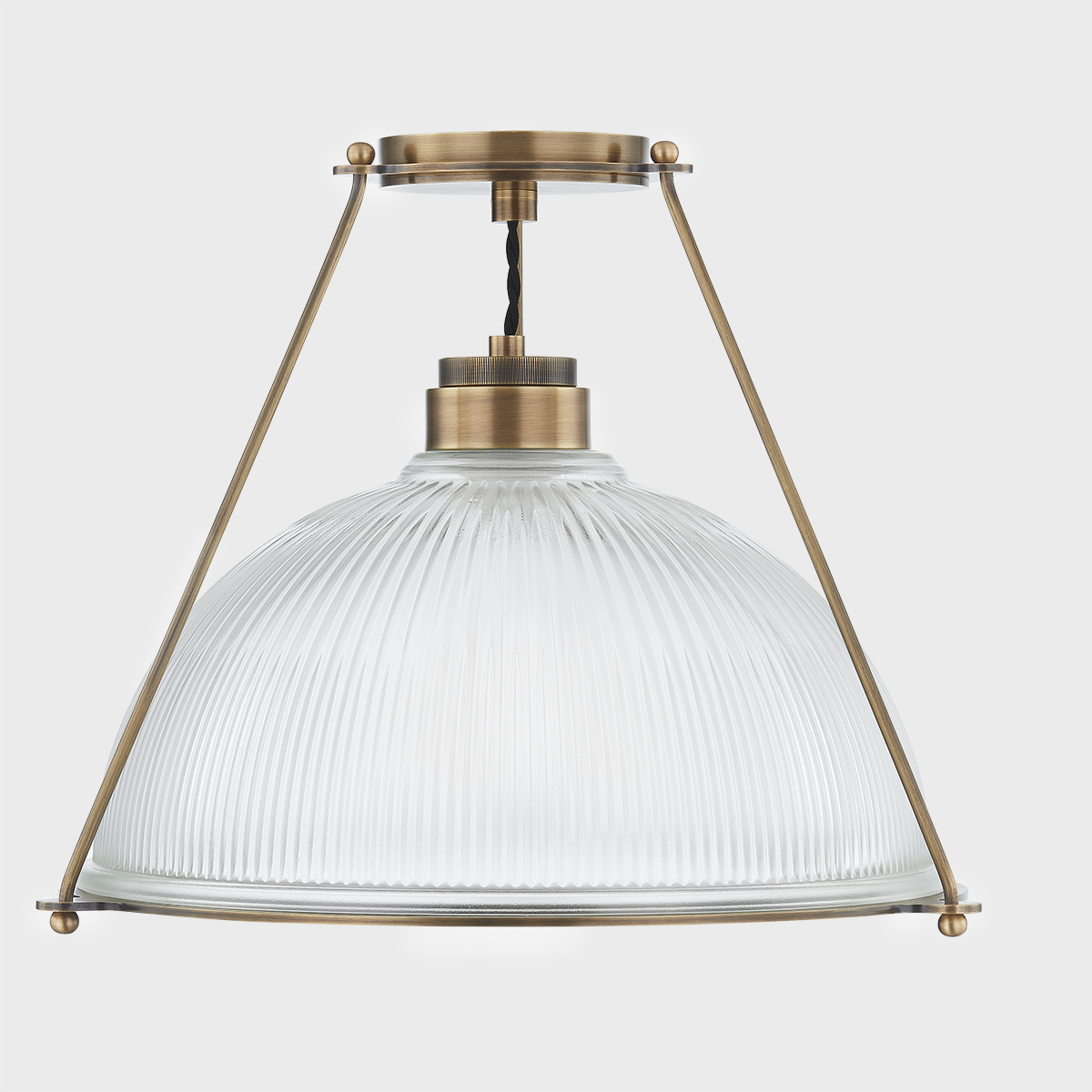 Industrial design with a modern edge, Glint features a dome shade of ribbed Holophane glass suspended from the ceiling within a unique Patina Brass framework. The twisted black fabric cord near the canopy adds a subtle vintage feel. This striking semi-flush mount makes a gorgeous statement close to the ceiling. Part of our Lauren Liess collection.