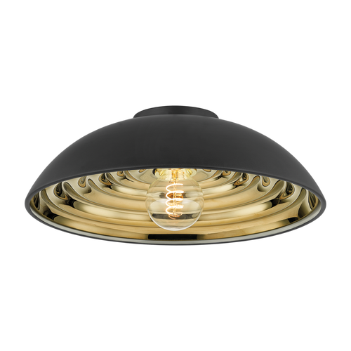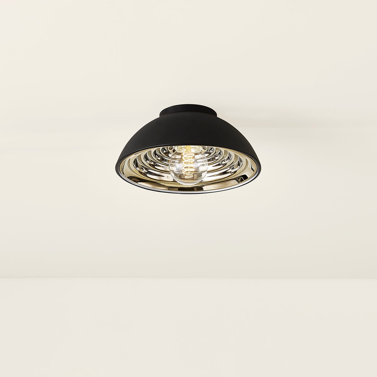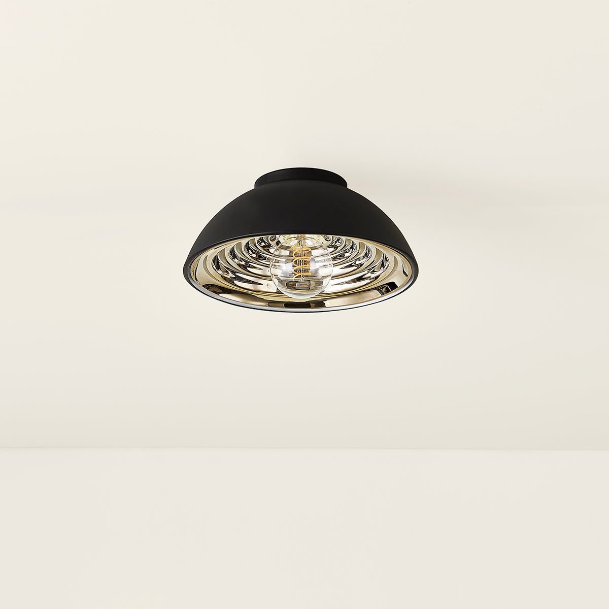 A concentric ring reflector and striking materiality elevate the simple disc silhouette of Eclipse. As light washes over the ripples of the Brass Plated Glass interior, it spreads outwards with a dramatic effect, not unlike the cosmic phenomenon for which it is named. Whether mounted on the wall or ceiling, the contrast between the Soft Black exterior of the shade and the golden interior leaves a lasting impression.