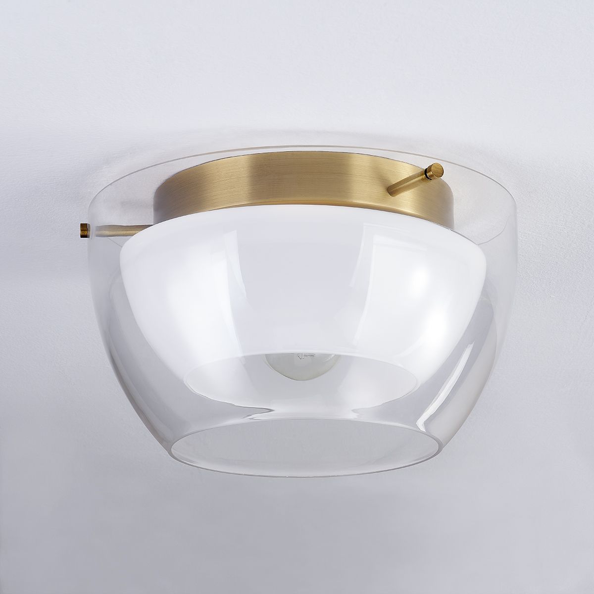 A smooth opal glossy glass shade and metal collar in Polished Nickel or Patina Brass are enclosed within a similarly shaped thick clear glass for a sophisticated layered look that makes this modern flush mount stand out. Openings in both the shade and the covering allow light to flow freely.