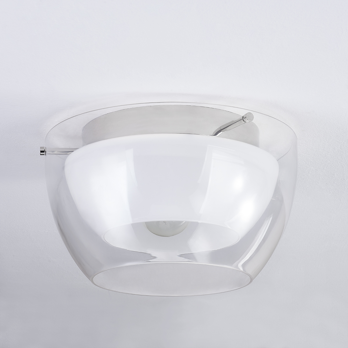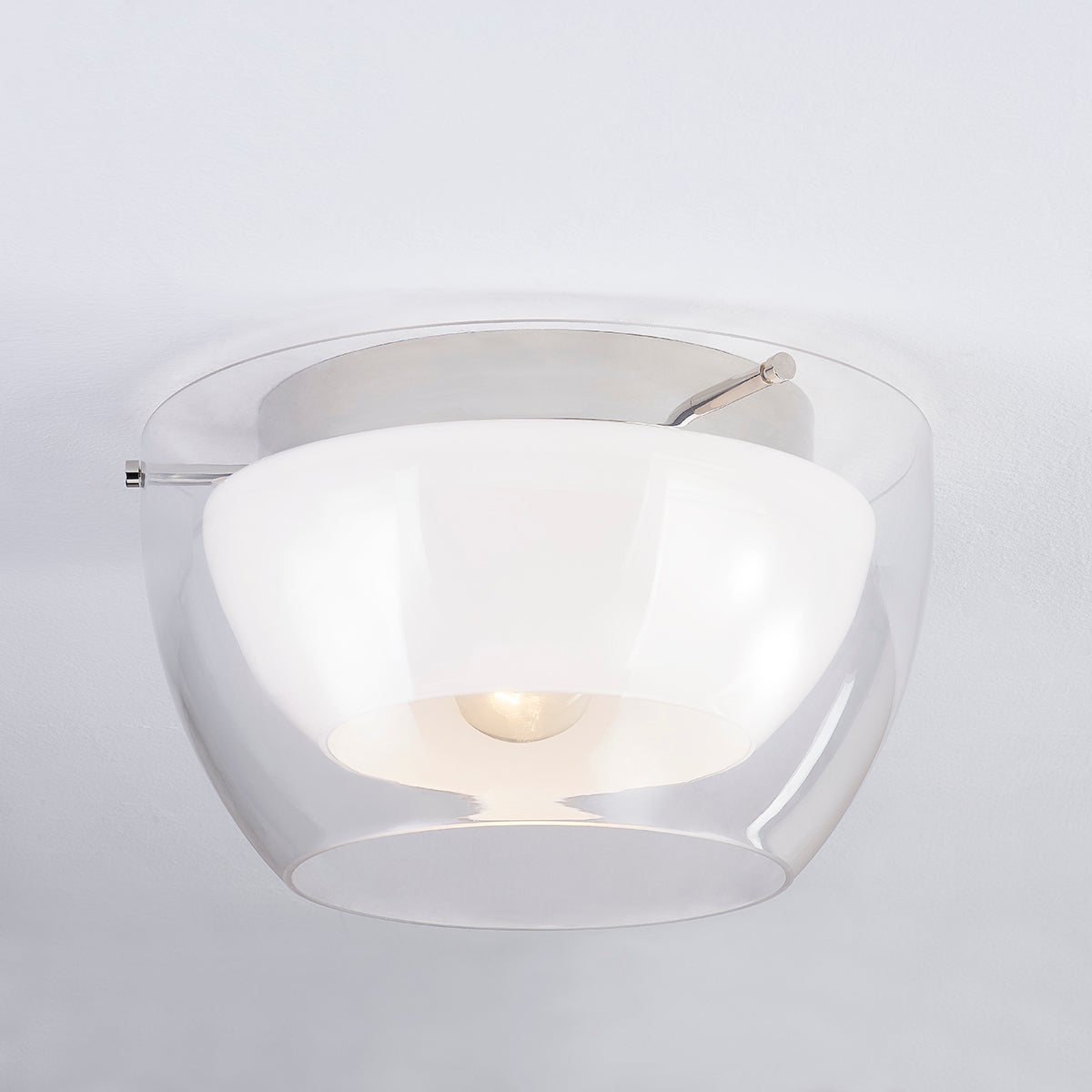 A smooth opal glossy glass shade and metal collar in Polished Nickel or Patina Brass are enclosed within a similarly shaped thick clear glass for a sophisticated layered look that makes this modern flush mount stand out. Openings in both the shade and the covering allow light to flow freely.