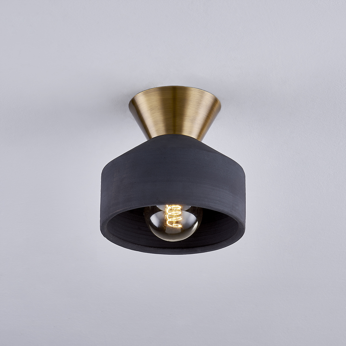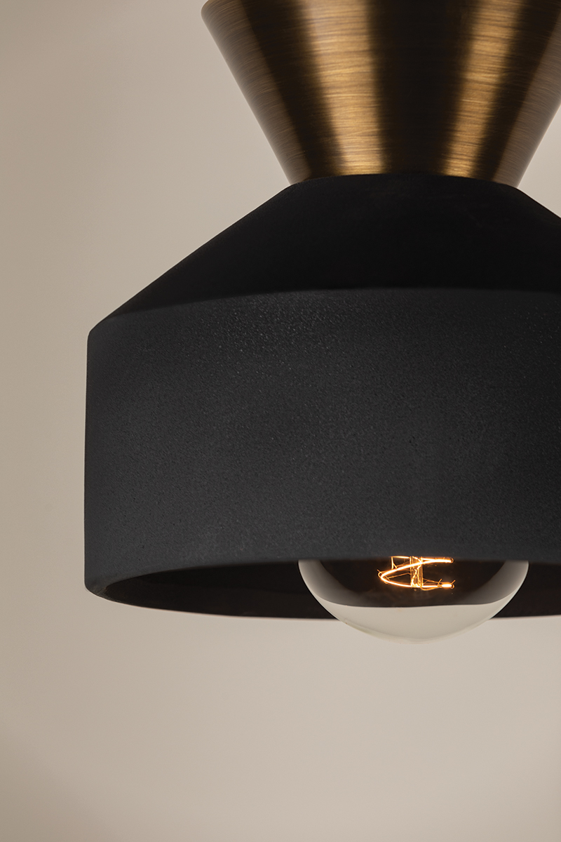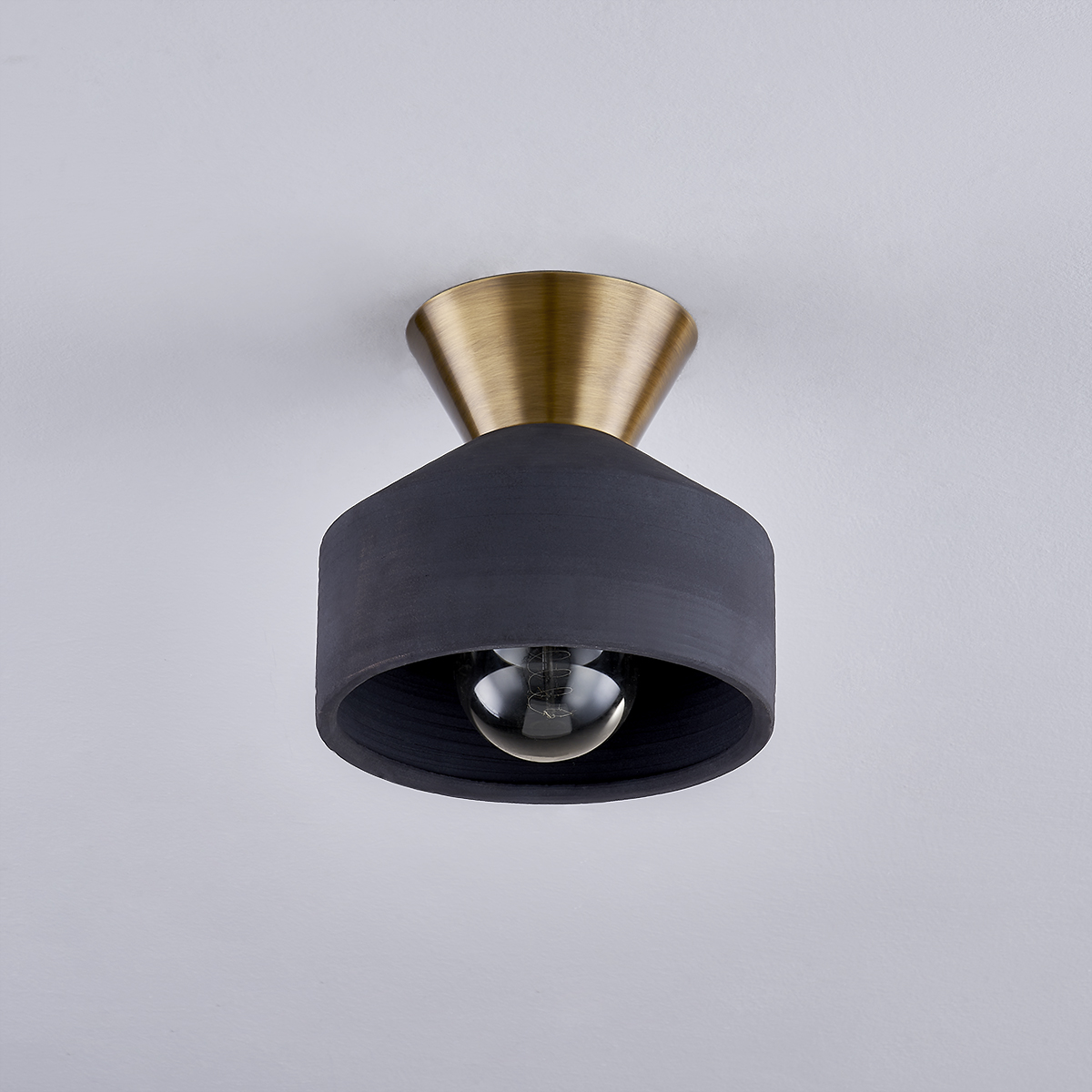 With its rich Ceramic Black shade and sleek Patina Brass collar, this flush mount is a beautiful balance of earthiness and sophistication. The dark matte finish of the ceramic pairs perfectly with the warm, sleek metalwork. Available in two sizes to bring a modern organic style to any space.