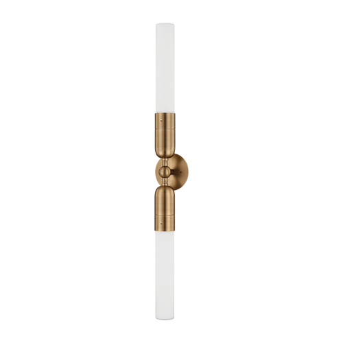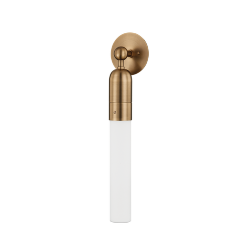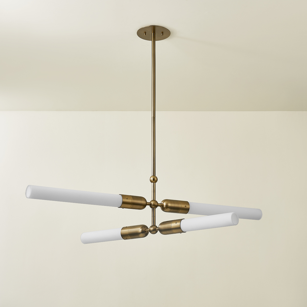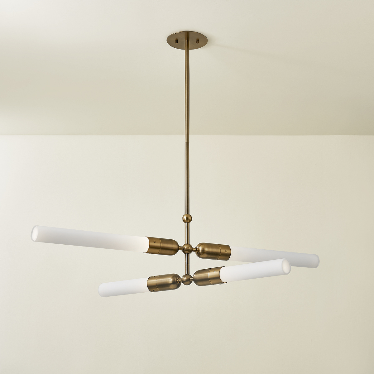 Exploring an unconventional lamping technique, Darby features tubes of etched glass that are lit at the central connection point, creating a fall-off of light along the length of the glass and an ombre effect. The design of the metalwork celebrates its mechanical connections, turning them into small but additive design details. Darby is available as a pendant, sconce in two sizes, and chandelier in a Patina Brass finish.