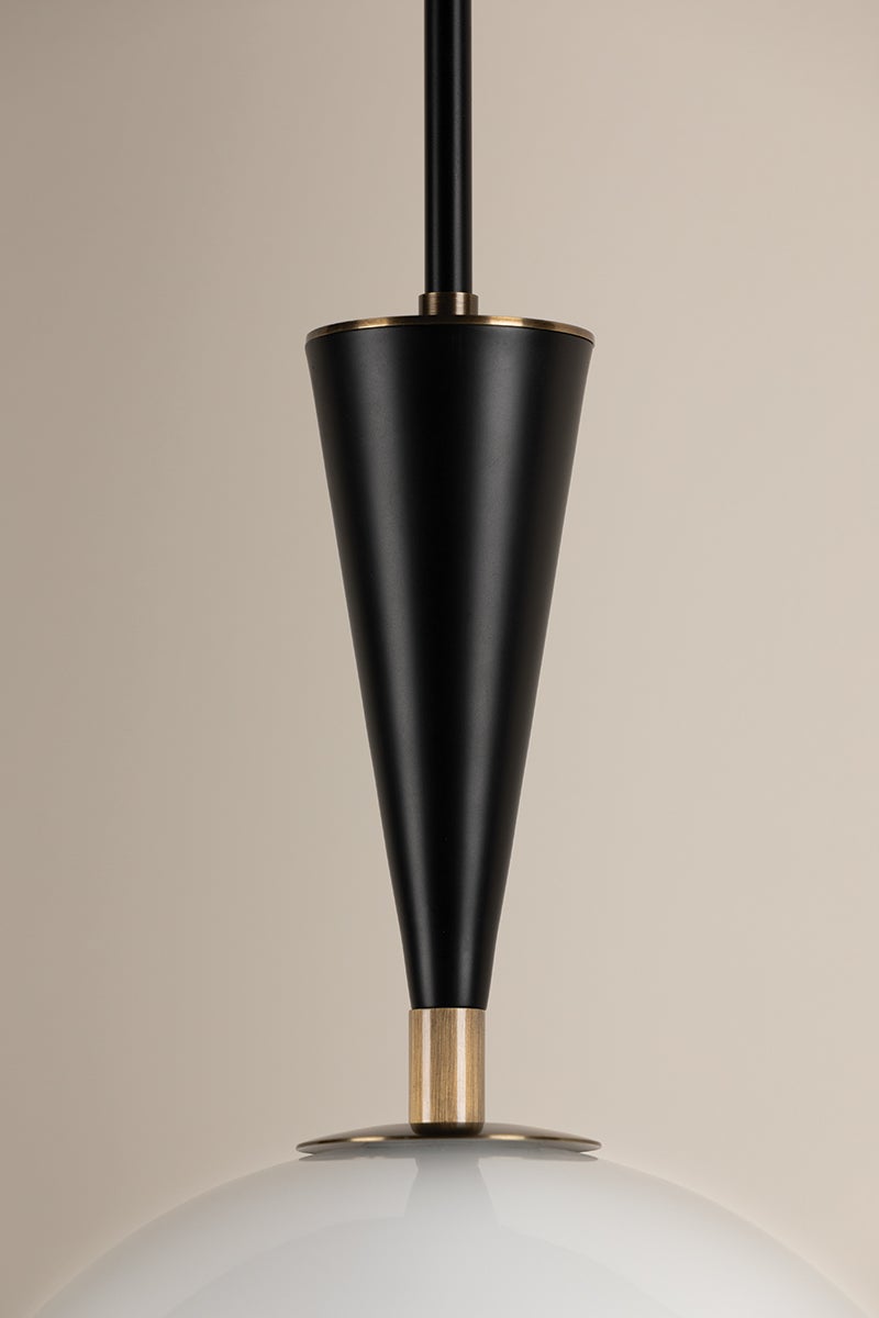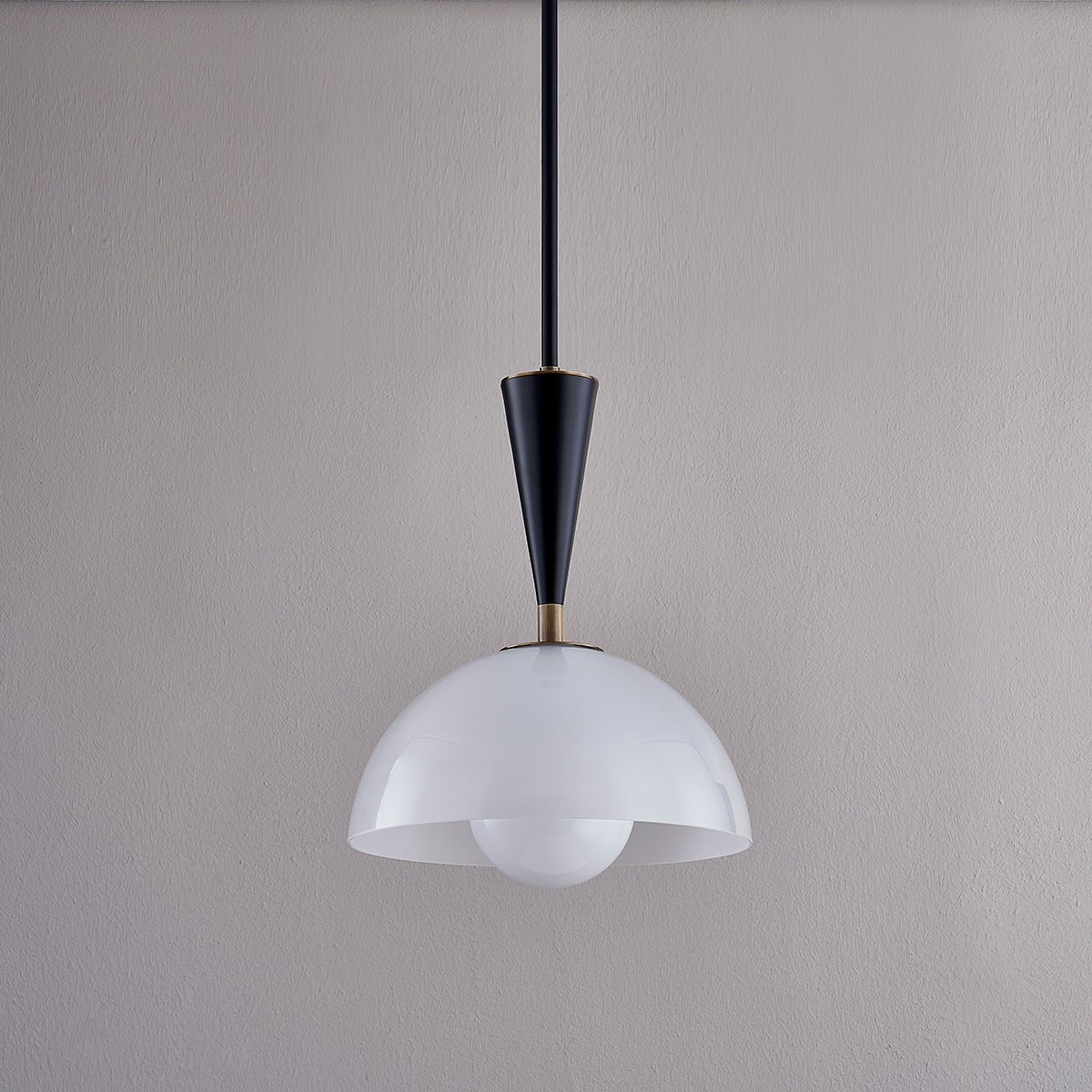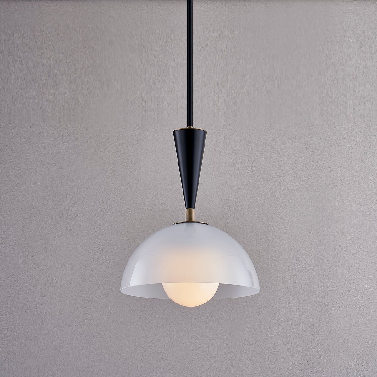 A dome-shaped shade is paired with a slender, conical neck creating a vintage-inspired silhouette that has a minimalist, modern appeal. The clear glass shade is etched on the inside and fills with a soft, gorgeous glow when lit. Pops of Patina Brass contrast beautifully with the Soft Black finish. The wall sconce can be mounted to provide uplight or downlight.