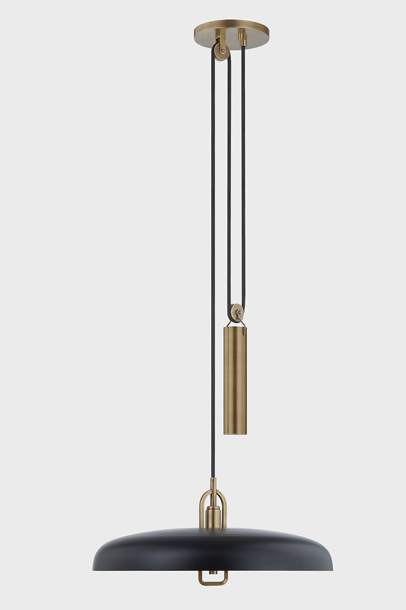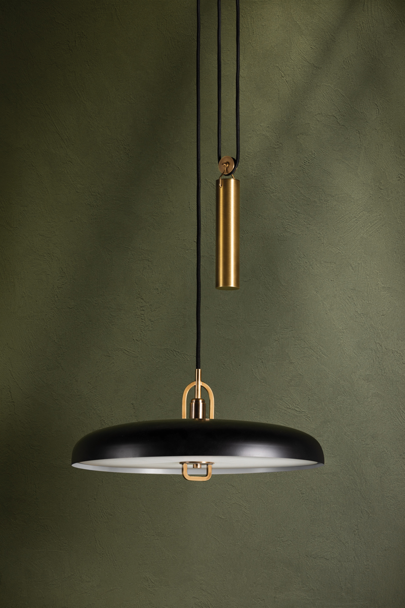 Plummet has a modern look with vintage inspiration. The functional design features a striking Patina Brass weighted pulley that draws the eye and serves a purpose—it allows the height of the pendant to be adjusted. The Soft Black or Soft Sand shade paired with a matte white acrylic diffuser gives the piece a fresh feel that works well with many interior styles. Part of our Lauren Liess collection.