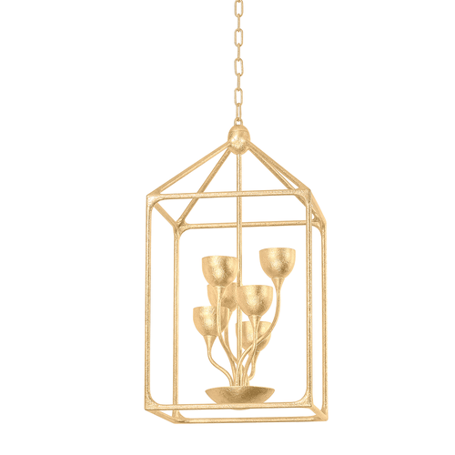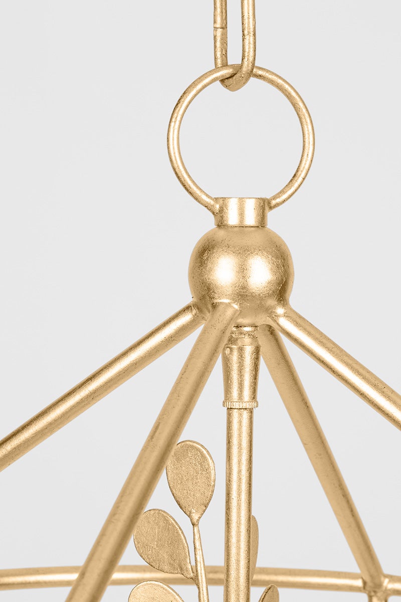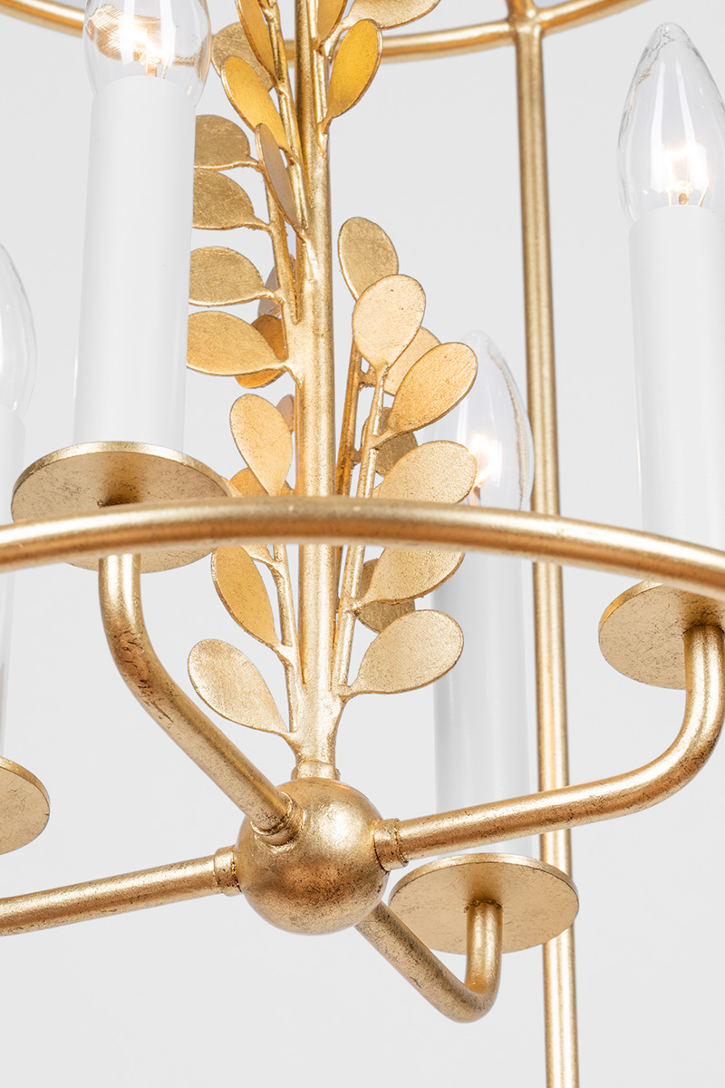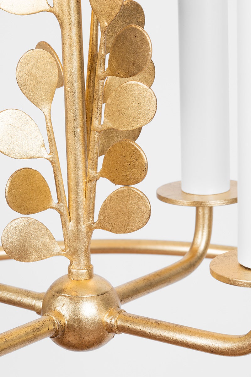 A botanical influence give these recognizable lantern and wall sconce silhouettes a fresh feel and a pretty, organic vibe. Smooth leaf shapes travel vine-like up and through the center of the lantern candlesticks and white linen sconce shade. A beautiful warm light reflects off the Vintage Gold Leaf finish.