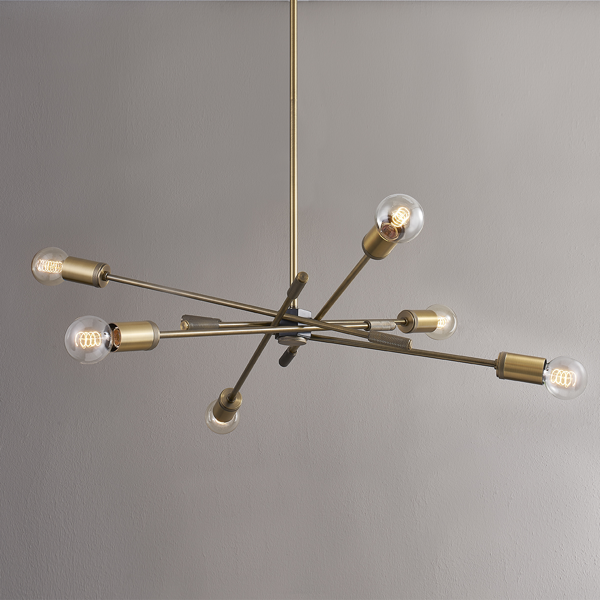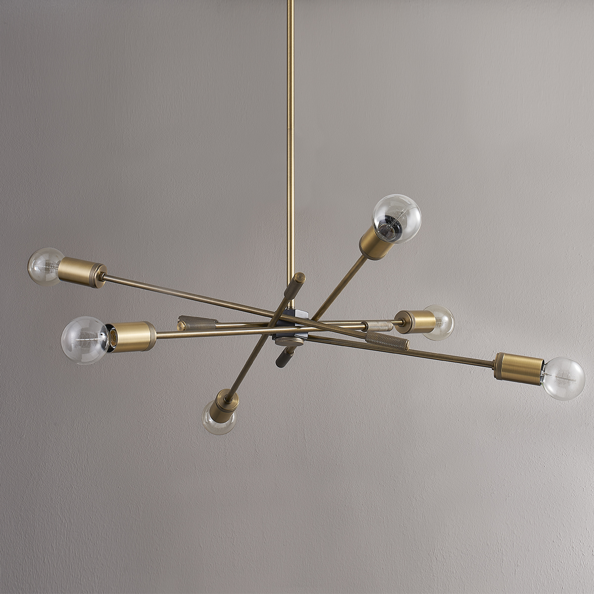 Straight, branch-like Patina Brass arms topped with exposed bulbs define Chino's sleek, modern silhouette. Knurled detailing on the tail and socket cup adds a touch of texture, and the Soft Black hexagonal center gives the chandelier a subtle two-tone finish. Also available as a wall sconce.